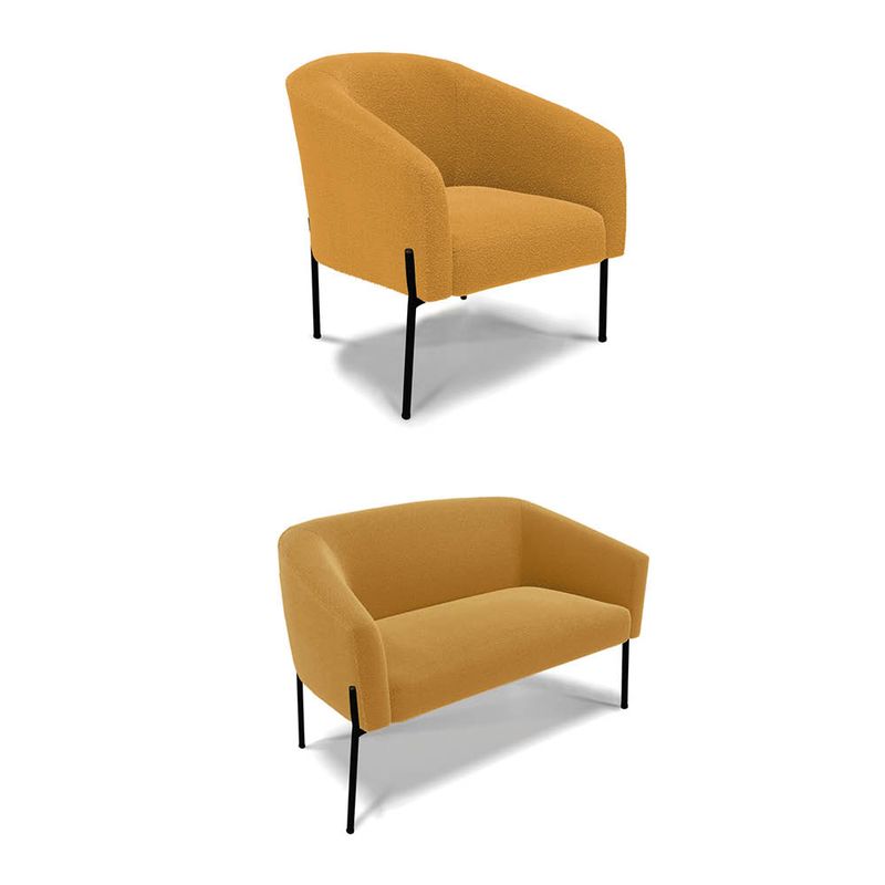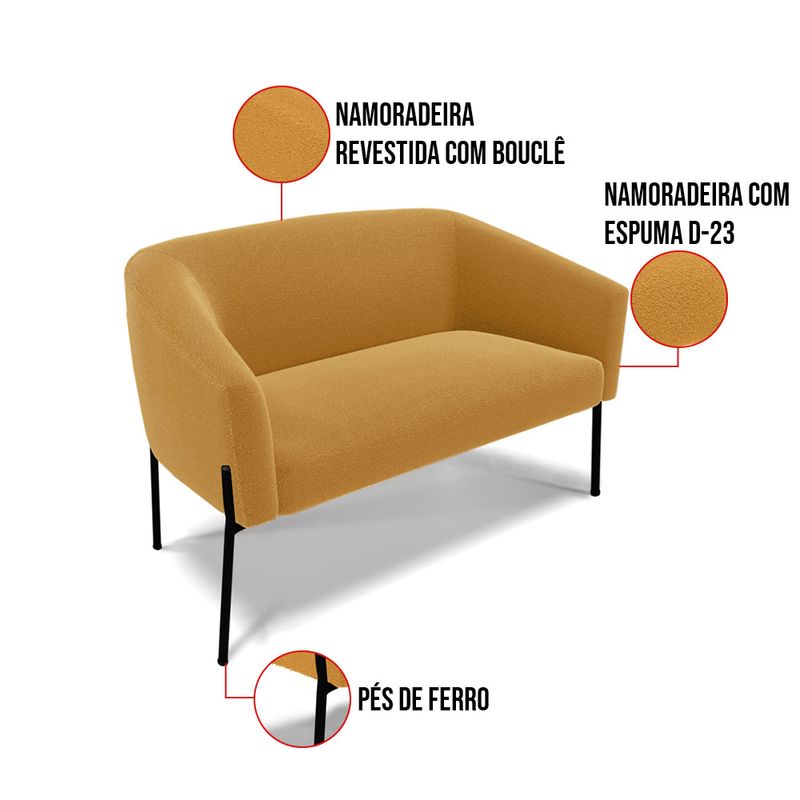 Tem novidades chegando por aqui! Olha só essa nossa inédita Namoradeira e Poltrona Stella Bouclê. Sim, as melhores opções em Namoradeira estão aqui! A Namoradeira e Poltrona Stella Bouclê é para todas as ocasiões, é ideal para você relaxar, assistir tv ou ler um livro, mantendo-o confortável ao longo do dia! Um estofado versátil, que foge do convencional pelo seu design e tecido luxuoso. Seu formato curvo, marcante e sofisticado, oferece conforto de forma excepcional, com aquela sensação de abraço, que deixa o coração quentinho! Desenvolvida com atenção aos detalhes, para atender todas suas expectativas e necessidades. Seu aspecto arredondado e anatômico, possibilita que a postura fique sempre alinhada, mantendo a coluna na posição correta. Ela dispõe de um acabamento impecável, revestida em Bouclê em tom Mostarda, um tecido maleável que além de ser muito bonito, é a grande tendência do momento, por ser uma lã mais refinada, quente, com toque suave e agradável, semelhante à textura natural da ovelha. Contém uma estrutura robusta, sua sustentação é dada pelos Pés de Ferro no tom Preto, que garantem mais segurança e firmeza ao sentar-se. Já o enchimento é feito em espuma D-23 no encosto e assento, garantindo maior conforto ao usuário. Ah! Vale a pena lembrar que a Namoradeira e Poltrona Stella Bouclê, foi produzida em quantidades limitadas, para aqueles que procuram criar um visual diferenciado e exclusivo. Então, não deixe de aproveitar esse lançamento, hem! Leve a sua agora mesmo. Dimensões da Poltrona: Altura Total: 81 cm Largura Total: 77 cm Profundidade Total: 60 cm Altura do Encosto: 40 cm Largura do Assento: 45 cm Profundidade do Assento: 45 cm Altura do chão ao Assento: 45 cm Espessura do Assento: 15 cm Espessura do braço: 7 cm Altura do chão ao braço: 70 cm Altura interna do braço: 28 cm Tamanho dos pés: 30 cm Peso: 17 kg Dimensões da Namoradeira: Altura Total: 81 cm Largura Total: 127 cm Profundidade Total: 60 cm Altura do Encosto: 40 cm Largura do Assento: 95 cm Profundidade do Assento: 45 cm Altura do chão ao Assento: 45 cm Espessura do Assento: 15 cm Espessura do braço: 7 cm Altura do chão ao braço: 70 cm Altura interna do braço: 28 cm Tamanho dos pés: 30 cm Peso: 25 kg Especificações do Produto: Estrutura: Madeira Eucalipto Espuma: D-23 Tecido: Bouclê Peso Suportado: Até 180 Kg Tipo de Pés: Pés de Ferro Lateral Preto Tipo de Encosto: Fixo Tipo de Assento: Fixo Complexidade da Montagem: Baixo Montagem: O produto vai montado, apenas parafusar a base Garantia: 90 dias contra defeito de fabricação Instruções de Limpeza: Utilizar um pano limpo e levemente úmido Você irá Receber: 01 Sofá Namoradeira e 01 Poltrona - Entregue em: 02 Volumes