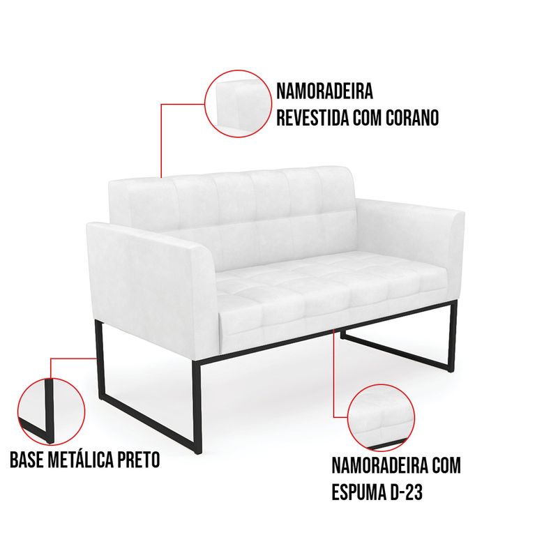 Você gosta de colecionar vários momentos memoráveis com sua família e amigos? Que tal recebê-los, com móveis de altíssima qualidade que só a D?Rossi tem? A Namoradeira 2 Lugares Elisa é adequada para você! Seu design retrô é a grande tendência do momento. Pode ser usada em diversos espaços da casa, em salas, hall de entrada, quartos, cozinhas, varanda, sacada, escritório, dentre outros. Contém as seguintes características: A estrutura é feita de madeira de Eucalipto 100% de reflorestamento, e a Base Metálica Industrial Preto, além de ser resistente e durável, suporta em média até 120 kg. Assento, encosto e braços, contém enchimento de espuma D-23 e é estofada em tecido Corano, no tom Branco, que oferece muito conforto e resistência ao sentar, com aquela sensação de maciez e aconchego. Possui também, detalhes de costura no encosto e assento, resultando em um acabamento impecável, conferindo muito mais valor e elegância ao seu espaço. Para complementar a decoração com essa linda namoradeira, a dica é utilizar mantas, almofadas ou vasinho de flor. E pronto, seu cantinho estará perfeito para descansar e relaxar! Aqui, você encontra várias opções, para que seus amigos e familiares se sintam acolhidos. Garanta já sua Namoradeira Elisa. Dimensões da Sofá Namoradeira: Altura total: 80 cm Largura total: 112 cm Profundidade total: 65 cm Altura do encosto: 36 cm Largura do assento: 94 cm Profundidade do assento: 47 cm Altura do chão ao assento: 46 cm Espessura do assento: 16 cm Tamanho dos pés: 30 cm Espessura do braço: 9 cm Peso: 19 kg Especificações do Produto Estrutura: Madeira Eucalipto Espuma: D-23 Tecido: Corano Tipo de pés: Base Metálica Industrial Peso suportado: Até 120 Kg Garantia: 90 dias contra defeito de fabricação Montagem: O produto vai montado, apenas rosquear os pés Instruções de limpeza: Utilizar um pano limpo e levemente úmido Você irá receber: 01 Sofá Namoradeira - Entregue em: 01 Volume Observações Relevantes - Todos os produtos vão embalados com total segurança; - As cores dos produtos podem sofrer alterações dependendo do seu monitor; - Para futuras compras, não garantimos a mesma tonalidade de cor, pois existe variação a cada lote do fabricante do tecido; - As imagens são meramente ilustrativas, não acompanham objetos de decoração e eletros; - Confira as dimensões do produto no momento da compra e certifique-se de que passará normalmente por escadas, elevadores, portas e corredores; - Importante: Por se tratar de estofado as medidas podem ter uma pequena variação em até 3 cm; - Não nos responsabilizamos no ato da entrega por montagens, desmontagens, instalações de produtos; - Não nos responsabilizamos no ato da entrega por subir escadas, elevadores, nem utilização de guinchos ou equipamentos similares para acesso a pisos superiores em apartamentos; - A entrega do produto é realizada em todo território nacional, até onde as rodovias alcançam, entregas fluviais ou aéreas devem ser cotadas a parte; - Observando as orientações acima, evita-se futuros desagrados ou imprevistos com a entrega do produto. Havendo despesas adicionais, serão de responsabilidade do cliente;