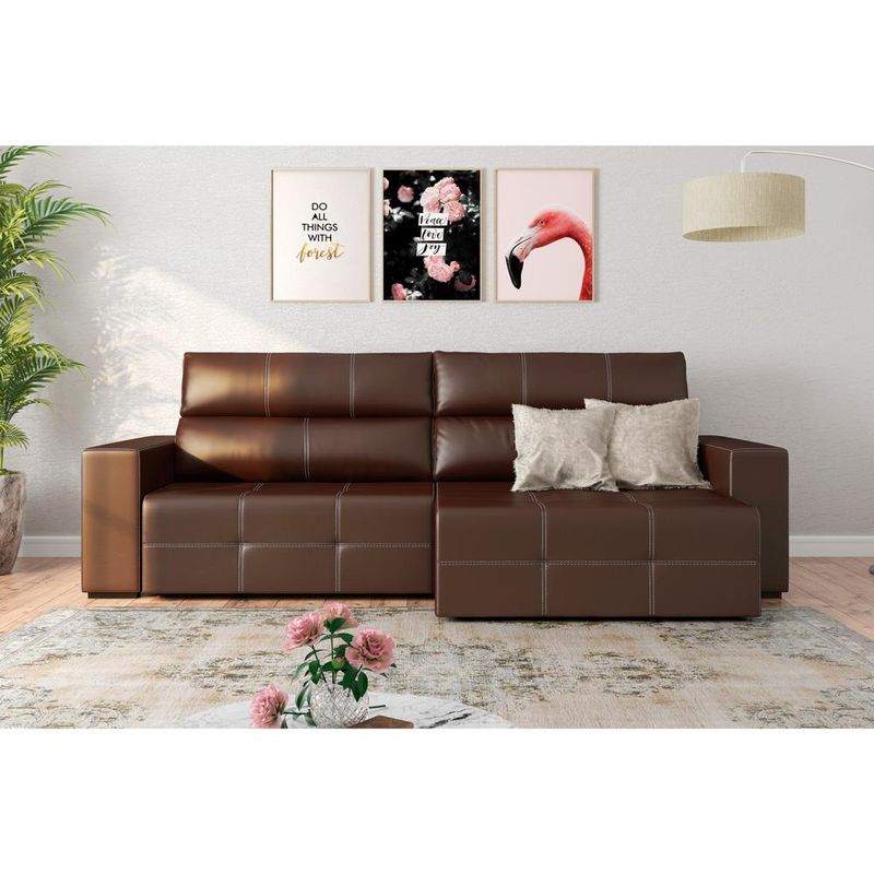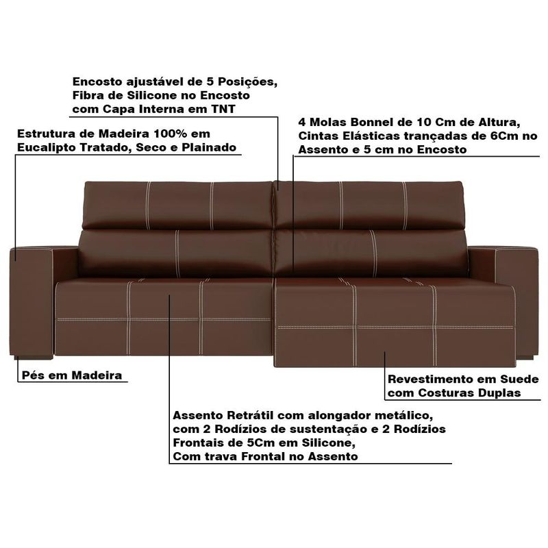 Descrição do Produto:Sofá Retrátil 244cm Nero PU Marrom - Gran Belo é aquele toque de elegância que falta em seu ambiente. Com design moderno, o Sofá Nero é produzido com madeira de eucalipto tratada, assim, seu ambiente além de elegante, também ajuda o meio ambiente. E tem mais, o encosto é ajustável em até 5 posições e possui trava frontal no assento retrátil. Corra e aproveite!Dimensões do Produto:Largura: 244 cm;Altura: 110 cm;Profundidade: 115 a 185 cm ;Largura do Assento: 100 cm;Largura do Braço: 22 cm;Características do Produto:Material da Estrutura: Madeira de eucalipto seca, tratada e plainada;Encosto: Cintas elásticas trançadas de 5 cm e Espuma D-28;Assento: Cintas elásticas trançadas de 6 cm e Espuma D-28;Material dos Pés: Madeira;Revestimento: PU;Diferencial: Assento retrátil com alongador metálico e 2 rodízios de sustentação e trava frontal no assento;Peso Suportado: 120 Kg;Conteúdo da Embalagem: 1 Sofá;Necessita de Montagem: Não;Instruções/Cuidado: Utilizar um pano levemente umedecido com água, seguido de pano seco. Evitar exposição ao sol, para que o produto não sofra alterações na cor. Não limpar com escovas ou produtos abrasivos.Observações importantes:- As imagens são meramente ilustrativas e não acompanham objetos de decoração e eletros.- Pode haver alguma diferença de tonalidade entre a imagem e o produto, por conta do tratamento de imagens e a calibração de cores da sua tela.- Todos os nossos produtos são enviados devidamente embalados e com total segurança.- Ao receber o produto o cliente deve verificar as condições da embalagem, havendo alguma avaria não assine o comprovante de recebimento, entre em contato com a loja para orientações.- A nossa loja se responsabilizará pela entrega dos produtos adquiridos até a porta de entrada ou portaria do endereço indicado.- Não nos responsabilizamos, no ato da entrega, por montagens, desmontagens e instalações de produtos, bem como, por subir ou descer escadas/elevadores ou pela utilização de guinchos ou equipamentos similares para acesso a pisos superiores em apartamentos, casas ou escritórios. Estas despesas adicionais serão de responsabilidade do cliente.- Confira as dimensões do produto no momento da compra e certifique-se de que passará normalmente por elevadores, portas, escadas e/ou corredores, evitando assim futuros desagrados ou imprevistos com a entrega do produto.