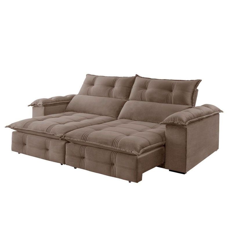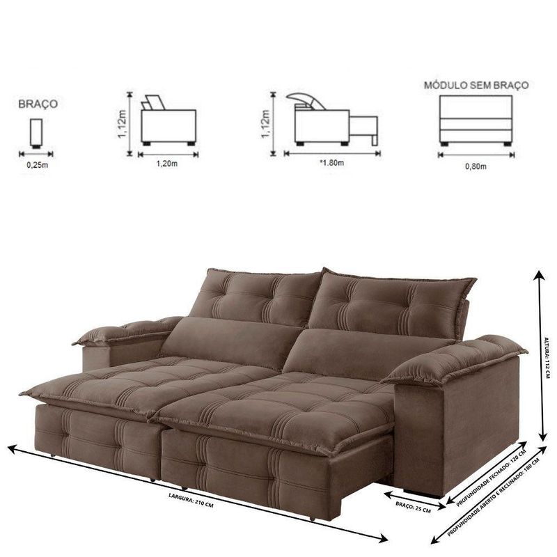 Sofá Retrátil E Reclinável Atlas 2,10m 03 Lugares Mola Ensacada Txr BegeSuavidade e conforto em sua casa com o Sofá Atlas que possui encosto reclinável, assento com Pillow de molas ensacadas , percinta elástica tipo italiana para maior durabilidade, fibra siliconada, assento retrátil com rodízios que facilitam seu movimento. Características: Marca: TXR Modelo: Atlas Tipo: Sofá 3 lugares Retrátil e Reclinável Estrutura: Madeira de origem certificada, Eucalipto Revestimento: Tecido Veludo Pés: Madeira Reflorestada Assento: Retrátil de duplo molejo - mola Bonnel + percinta tipo Italiana + Pillow de molas ensacadas com espuma D28 Encosto: Reclinável em 5 estágios, 100 fibra de silicone Braços: 25 cm com pillow 100 fibra de silicone Retrátil e Reclinável: Com mecanismo em aço Dimensões: Altura: 112 cm Largura: 210 cm Profundidade Fechado: 120 cm Profundidade Aberto: 180 cm (com encosto reclinado) Peso: 94 kg Garantia do Fornecedor: 03 meses Atenção !!! Não possuímos serviço de montagem. Não nos responsabilizamos pelos custos de montagem. É de extrema importância ficar atento às dimensões dos produtos, pois é de sua total responsabilidade caso o produto tenha dimensões superiores ao local de acesso da entrega dificultando ou impossibilitando que a mesma seja concluída. Não nos responsabilizamos, no ato da entrega, por subir escadas, corredores e elevadores ou transporte por guincho em apartamentos. Não nos responsabilizamos por transtornos com a entrega caso o produto necessite de desmontagem, nem pelos custos gerados por esta situação. Imagens meramente ilustrativas. A cor pode variar de acordo com a iluminação do ambiente. Itens de decoração não inclusos. Sobre Embalagem: papelão e malha.