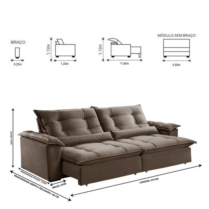 Sofá Retrátil E Reclinável Apolo 2,10m 03 Lugares Mola Ensacada Txr BegeSuavidade e conforto em sua casa com o Sofá Apolo que possui encosto reclinável, assento com Pillow de molas ensacadas , percinta elástica tipo italiana para maior durabilidade, fibra siliconada, assento retrátil com rodízios que facilitam seu movimento. Características: Marca: TXR Modelo: Apolo Tipo: Sofá 3 lugares Retrátil e Reclinável Estrutura: Madeira de origem certificada, Eucalipto Revestimento: Tecido Veludo Pés: Madeira Reflorestada Assento: Retrátil de duplo molejo - mola Bonnel + percinta tipo Italiana + Pillow de molas ensacadas com espuma D28 Encosto: Reclinável em 5 estágios, 100 fibra de silicone Braços: 25 cm com pillow 100 fibra de silicone Rineira: Almofada de fibra de silicone com zíper Retrátil e Reclinável: Com mecanismo em aço Dimensões: Altura: 112 cm Largura: 210 cm Profundidade Fechado: 120 cm Profundidade Aberto: 180 cm (com encosto reclinado) Peso: 94 kg Garantia do Fornecedor: 03 meses Atenção !!! Não possuímos serviço de montagem. Não nos responsabilizamos pelos custos de montagem. É de extrema importância ficar atento às dimensões dos produtos, pois é de sua total responsabilidade caso o produto tenha dimensões superiores ao local de acesso da entrega dificultando ou impossibilitando que a mesma seja concluída. Não nos responsabilizamos, no ato da entrega, por subir escadas, corredores e elevadores ou transporte por guincho em apartamentos. Não nos responsabilizamos por transtornos com a entrega caso o produto necessite de desmontagem, nem pelos custos gerados por esta situação. Imagens meramente ilustrativas. A cor pode variar de acordo com a iluminação do ambiente. Itens de decoração não inclusos.