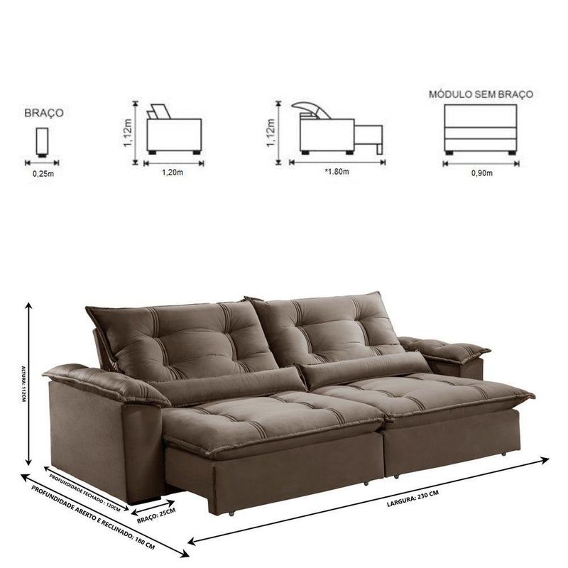 Sofá Retrátil E Reclinável Apolo 2,30m 04 Lugares Mola Ensacada Txr BegeSuavidade e conforto em sua casa com o Sofá Apolo que possui encosto reclinável, assento com Pillow de molas ensacadas , percinta elástica tipo italiana para maior durabilidade, fibra siliconada, assento retrátil com rodízios que facilitam seu movimento. Características: Marca: TXR Modelo: Apolo Tipo: Sofá 4 lugares Retrátil e Reclinável Estrutura: Madeira de origem certificada, Eucalipto Revestimento: Tecido Veludo Pés: Madeira Reflorestada Assento: Retrátil de duplo molejo - mola Bonnel + percinta tipo Italiana + Pillow de molas ensacadas com espuma D28 Encosto: Reclinável em 5 estágios, 100 fibra de silicone Braços: 25 cm com pillow 100 fibra de silicone Rineira: Almofada de fibra de silicone com zíper Retrátil e Reclinável: Com mecanismo em aço Dimensões: Altura: 112 cm Largura: 230 cm Profundidade Fechado: 120 cm Profundidade Aberto: 180 cm (com encosto reclinado) Peso: 99 kg Garantia do Fornecedor: 03 meses Atenção !!! Não possuímos serviço de montagem. Não nos responsabilizamos pelos custos de montagem. É de extrema importância ficar atento às dimensões dos produtos, pois é de sua total responsabilidade caso o produto tenha dimensões superiores ao local de acesso da entrega dificultando ou impossibilitando que a mesma seja concluída. Não nos responsabilizamos, no ato da entrega, por subir escadas, corredores e elevadores ou transporte por guincho em apartamentos. Não nos responsabilizamos por transtornos com a entrega caso o produto necessite de desmontagem, nem pelos custos gerados por esta situação. Imagens meramente ilustrativas. A cor pode variar de acordo com a iluminação do ambiente. Itens de decoração não inclusos. Sobre Embalagem: papelão e malha.