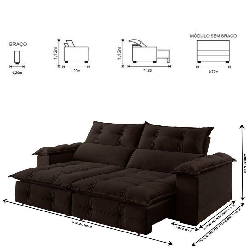Sofá Retrátil E Reclinável Atlas 1,80m 02 Lugares Mola Ensacada Txr MarromSuavidade e conforto em sua casa com o Sofá Atlas que possui encosto reclinável, assento com Pillow de molas ensacadas , percinta elástica tipo italiana para maior durabilidade, fibra siliconada, assento retrátil com rodízios que facilitam seu movimento. Características: Marca: TXR Modelo: Atlas Tipo: Sofá 2 lugares Retrátil e Reclinável Estrutura: Madeira de origem certificada, Eucalipto Revestimento: Tecido Veludo Pés: Madeira Reflorestada Assento: Retrátil de duplo molejo - mola Bonnel + percinta tipo Italiana + Pillow de molas ensacadas com espuma D28 Encosto: Reclinável em 5 estágios, 100 fibra de silicone Braços: 20 cm com pillow 100 fibra de silicone Retrátil e Reclinável: Com mecanismo em aço Dimensões: Altura: 112 cm Largura: 180 cm Profundidade Fechado: 120 cm Profundidade Aberto: 180 cm (com encosto reclinado) Peso: 83 kg Garantia do Fornecedor: 03 meses Atenção !!! Não possuímos serviço de montagem. Não nos responsabilizamos pelos custos de montagem. É de extrema importância ficar atento às dimensões dos produtos, pois é de sua total responsabilidade caso o produto tenha dimensões superiores ao local de acesso da entrega dificultando ou impossibilitando que a mesma seja concluída. Não nos responsabilizamos, no ato da entrega, por subir escadas, corredores e elevadores ou transporte por guincho em apartamentos. Não nos responsabilizamos por transtornos com a entrega caso o produto necessite de desmontagem, nem pelos custos gerados por esta situação. Imagens meramente ilustrativas. A cor pode variar de acordo com a iluminação do ambiente. Itens de decoração não inclusos. Sobre Embalagem: papelão e malha.