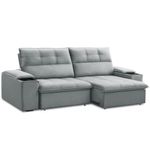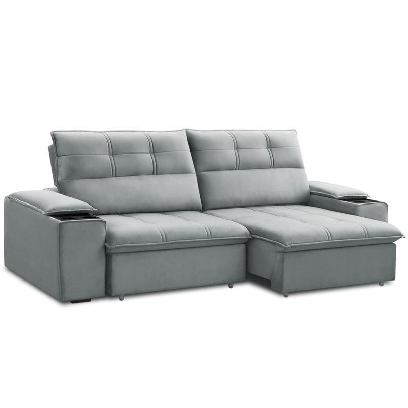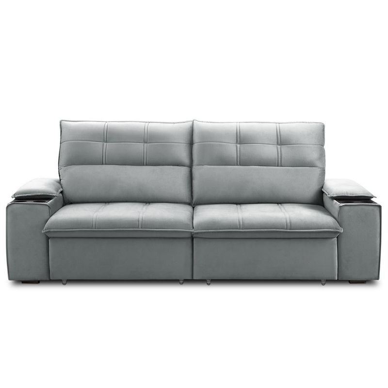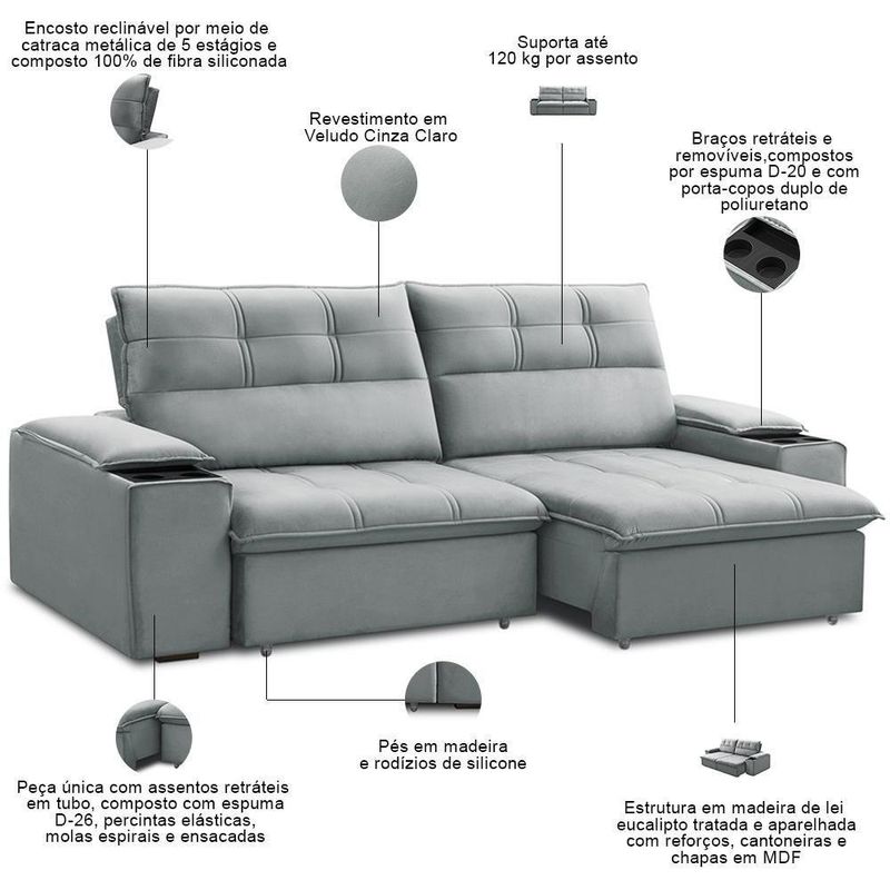 Sofá Retrátil Reclinável Para Sala 3 Lugares 250cm Zayn F04 Veludo Cinza Claro - Lyam DecorTransforme seu espaço com o Sofá Retrátil Reclinável Zayn 250cm, da Lyam Decor, conforto inteligente para todos os ambientes!Perfeito sala de estar, sala de TV ou home theater, o sofá Zayn une funcionalidade e estilo em um design que não economiza conforto. Com molas espirais e espuma D26 de alta densidade, o assento desse sofá 3 lugares oferece suporte ergonômico e maciez duradoura, ideal para quem adora maratonar séries ou curtir momentos especiais com família e amigos. Além disso, os detalhes fazem toda diferença: encosto reclinável para ajustar seu ângulo de descanso, porta-copos integrados para praticidade e um visual moderno, que se adapta a qualquer decoração. Quer um toque extra de aconchego? Basta adicionar almofadas decorativas e uma manta fofa para criar o cantinho perfeito! Se você busca um sofá retrátil versátil, durável e cheio de personalidade, o Zayn é a escolha certa. Conforto que cabe no seu espaço e no seu estilo! Dimensões do Produto (L x A x P) 250 x 110 x 98 cm Medidas Internas Profundidade total com o assento aberto: 137 cm Características: Estrutura em madeira de lei eucalipto tratada e aparelhada com reforços, cantoneiras e chapas em MDF. Revestimento em tecido Veludo de alta qualidade na tonalidade Cinza Claro. Peça única com assentos retráteis em tubo, composto por espuma D-26, molas ensacadas e molas espirais. Encosto reclinável por meio de catraca metálica de 5 estágios, composto por 100% de fibra siliconada. Percintas elásticas no assento para maior resistência e durabilidade. Braços retráteis e removíveis, compostos por espuma D-20 e com porta-copos duplo de poliuretano. Pés em madeira e rodízios de silicone. Peso suportado: Até 120 kg por assento. - Nunca sentar nos braços ou encosto do produto. - Por se tratar de estofado as medidas podem ter uma pequena variação de até 3 cm. - A tonalidade do produto real poderá ter ligeira variação devido o lote de tecidos. - Indicado para uso residencial, sua limpeza deve ser feita com pano levemente umedecido em água limpa, sem esfregar, não utilizar produtos abrasivos, desengordurantes, álcool ou solvente. Observações importantes: - Produto para uso residencial em ambiente interno, não devendo ficar exposto diretamente ao sol, calor e umidade excessivos. - Pode haver alguma diferença de tonalidade entre a imagem e o produto real, por conta do tratamento de imagens e a calibração de cores do seu monitor. - As imagens são meramente ilustrativas, não acompanham objetos de decoração e eletrônicos. - Ao receber a mercadoria, o cliente deve verificar as condições da embalagem, caso haja alguma avaria não assine o comprovante de recebimento e entre em contato com nossa loja para orientações. - Montagem, desmontagem e outras instalações serão de responsabilidade do cliente. Não nos responsabilizamos, no ato da entrega, por subir escadas/elevadores ou pelo transporte por guincho em apartamentos. Eventuais despesas são de responsabilidade do comprador. - Confira as dimensões do produto e certifique-se de que passará normalmente por supostos elevadores, portas, escadas e/ou corredores de sua residência. Unidades por kit: 1 | Cor: Cinza claro | Requer montagem: Não | Altura: 110 cm | Tipo de produto: Sofá Retrátil Reclinável | Peso máximo suportado: 240 kg | Peso: 80 Kg | Orientação do Sofá: Frontal | Mecanismo de abertura do produto: Manual, rodízios de silicone | Material do estofamento: Veludo | Material de enchimento do encosto: Fibra Siliconada | Linha: Sala de Estar | Formato do sofá: Linear | Estilo: Moderno | Desenho do tecido: Liso | Fabricante: Lyam Decor | Largura: 250 cm | Densidade da espuma do assento: D-26 | Cor dos pés: Marrom | Profundidade: 98 cm | Quantidade de Caixas de embalagem: 1
