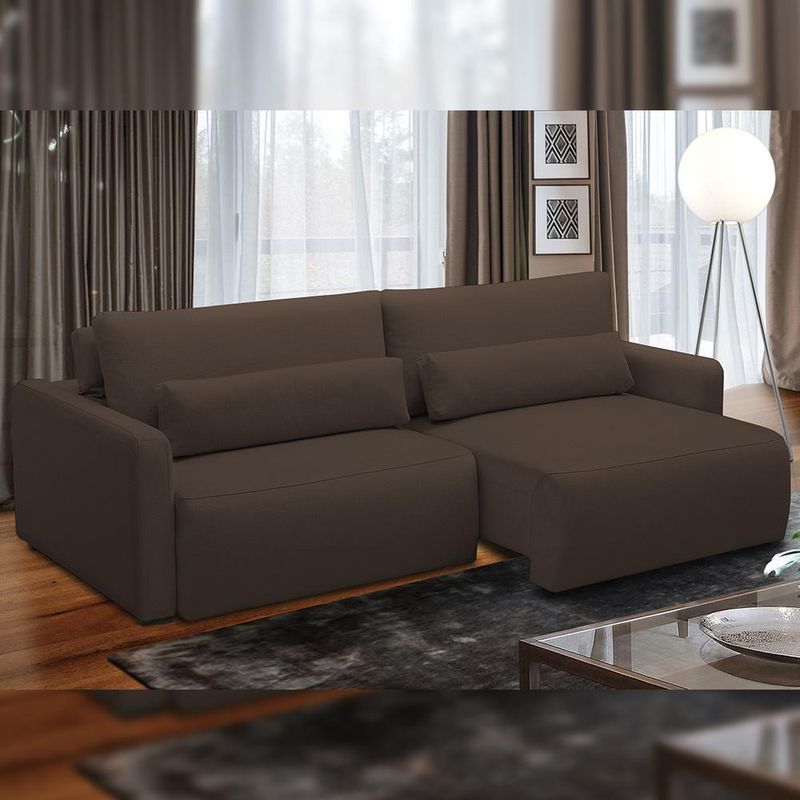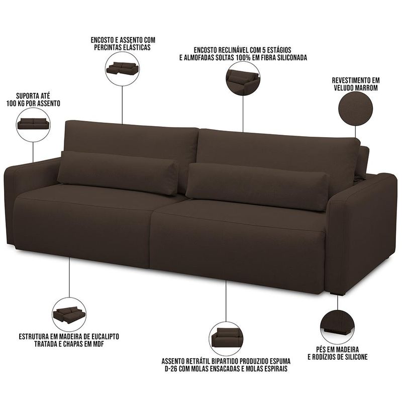 O Sofá Retrátil Reclinável Para Sala de Estar Living 210cm Sevilha é a combinação perfeita de conforto e estilo para sua sala de estar. Feito com materiais de alta qualidade, com revestimento em linho e estrutura de madeira de eucalipto e MDF, este sofá para sala é durável e resistente. Com seu encosto reclinável e assento retrátil, você pode ajustar o nível de conforto de acordo com suas necessidades, enquanto os pés de madeira adicionam um toque elegante ao design. Com espaço para até três pessoas, este sofá retrátil e reclinável é ideal para receber amigos e familiares, tanto para assistir a um filme ou relaxar após um longo dia, sempre com máximo conforto e bem-estar. Adquira agora mesmo este sofá moderno e transforme sua sala em um espaço acolhedor e versátil. Dimensões do produto (L x A x P) 210 cm x 95 cm x 125 cm Medidas internas: Altura do encosto: 50 cm Altura do assento ao chão: 48 cm Largura do assento: 90 cm cada Braça (L x A x P): 15 x 63 x 115 cm Peso aproximado: 75 kg Características: Estrutura fabricada com madeira de eucalipto tratado e chapas em MDF. Revestimento em Veludo de qualidade na tonalidade Marrom. Percintas elásticas no encosto e assento para maior durabilidade e resistência. Encosto reclinável por meio de catraca metálica com 5 estágios e almofadas soltas 100% em fibra siliconada. Assento retrátil bipartido em tubo com espumas D-26, molas ensacadas e molas espirais. Acabamento com costura rebatida, garantindo maior resistência a abertura de costuras. Pés em Madeira e rodízios de silicone. Braças removíveis compostas por espuma D-20. Modelo de 2 assentos e comporta até 3 lugares. Suporta até 100 kg por assento. - Por se tratar de estofado as medidas podem ter uma pequena variação de até 3 cm. - A tonalidade do produto real poderá ter ligeira variação devido o lote de tecidos. Observações importantes: - A montagem será de responsabilidade do comprador. - Responsabilizamo-nos pela entrega em todo território nacional, até onde as rodovias alcançam, entregas fluviais ou aéreas devem ser cotadas a parte. - As imagens são ilustrativas, não acompanham objetos de decoração e eletrônicos. - Não nos responsabilizamos, no ato da entrega, por subir escadas/elevadores ou transporte por guincho em apartamentos. - Eventuais despesas são de responsabilidade do comprador. - Confira as dimensões do produto e certifique-se de que passará normalmente por supostos elevadores, portas, escadas e/ou corredores de sua residência.