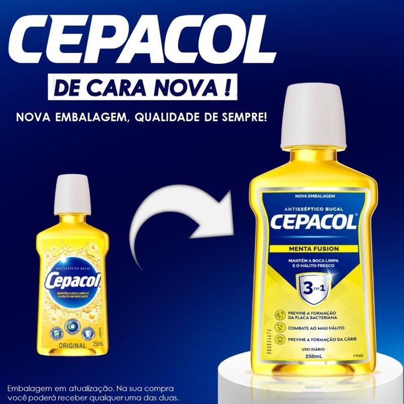 Solução Bucal Cepacol Tradicional 250mlSolução Bucal Cepacol Tradicional é um enxaguante bucal de uso diário com ação antisséptica e antibacteriana que ajuda eliminar as bactérias e germes da boca diminuindo cáries, placa bacteriana e mau hálito proporcionando uma boca mais saudável e um hálito refrescante.