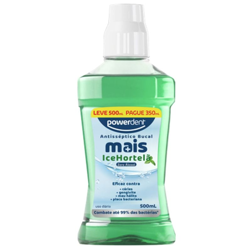 Antisséptico Bucal Powerdent Mais Ice Hortelã Zero Álcool 500ml Refrescância intensa e proteção completa sem álcool! O Antisséptico Bucal Powerdent Mais Ice Hortelã proporciona uma higiene bucal eficaz, ajudando a eliminar germes e bactérias causadoras do mau hálito. Com fórmula zero álcool, é mais suave para as gengivas, ideal para uso diário sem causar ardência. Com sabor refrescante de hortelã ice, o antisséptico Powerdent age nos locais onde a escova de dentes não alcança, proporcionando sensação de limpeza prolongada. Sua fórmula auxilia na prevenção de cáries, gengivite e mau hálito, deixando a boca protegida por muito mais tempo. A embalagem de 500ml oferece excelente rendimento para o uso diário de toda a família. Benefícios Elimina germes e bactérias causadoras do mau hálito; Fórmula zero álcool – não causa ardência; Refrescância intensa com sabor de hortelã gelado; Ajuda a prevenir cáries e gengivite; Uso diário para higiene bucal completa e prolongada. Modo de Uso Após escovar os dentes, enxágue a boca com 15 ml do produto puro por 30 segundos e elimine o excesso. Não é necessário enxaguar com água. Use de 2 a 3 vezes ao dia ou conforme orientação do dentista. Precauções e Advertências Não engolir o produto; Indicado para adultos e crianças acima de 6 anos com supervisão; Manter fora do alcance de crianças; Conservar em local fresco e ao abrigo da luz.