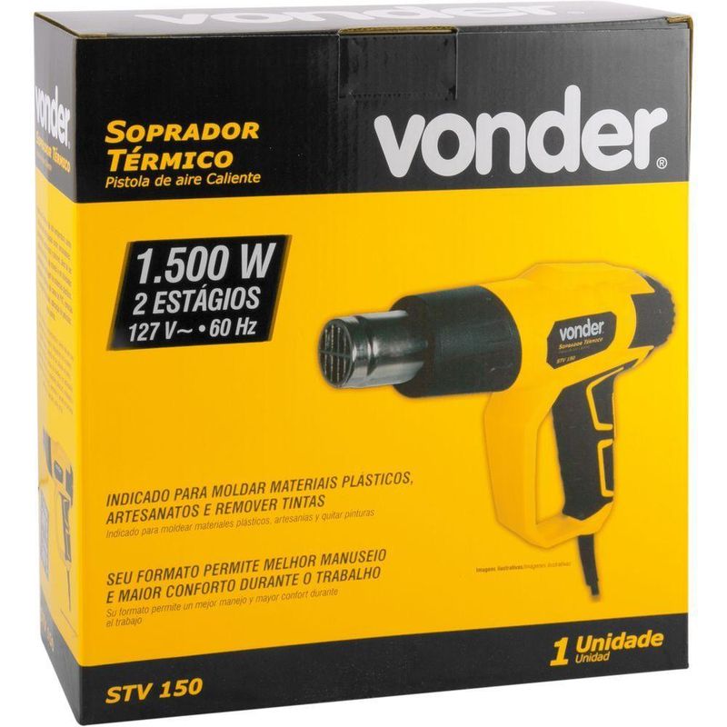 Soprador Térmico Vonder Stv150 110VRef. Fornecedor: 6001015127Marca: VonderConteúdo Embalagem:1 Soprador térmico. Acompanha: 1 Bocal plano, 1 bocal de desvio, 1 bocal de ponta e 1 bocal de deflexão.Aplicações e dicas de uso:Indicado para moldar materiais plásticos, artesanatos e remover tintas. Produz um fluxo de ar de alta temperatura, sendo indicado para profissionais como: encanadores, marceneiros, carpinteiros e pintores, além de ser muito útil em fábricas de móveis e em atividades relacionadas à moldagem de materiais plásticos, moldagem e instalação de canos de PVC, remoção ou secagem de pinturas, aplicação de películas, entre outras.Destaques e diferenciais:Produto certificado de acordo com as normas IEC 60335-1, IEC 60335-2-45 e Portaria 371/2009 do Inmetro, atestando o rigor técnico e qualidade já reconhecidos da marca. Seu formato tipo pistola permite melhor manuseio e maior conforto durante o trabalho. Além disso, possui motor com dupla isolação, garantindo maior segurança ao operador.Características Técnicas:Número de estágio do soprador térmico: 02 estágios Potência 1° estágio do soprador térmico: 750 W Temperatura 1° estágio do soprador térmico: 300° C Fluxo de ar 1° estágio do soprador térmico: 280 Litros/min Potência 2° estágio do soprador térmico: 1.500 W Temperatura 2° estágio do soprador térmico: 500° C Fluxo de ar 2° estágio do soprador térmico: 480 Litros/min Potência 3° estágio do soprador térmico: N/A Temperatura 3° estágio do soprador térmico: N/A Fluxo de ar 3° estágio do soprador térmico: N/A Tensão (V): 110V~ Segue norma: ABNT NBR IEC 60335-1 e IEC 60335-2-45 Produto: Soprador | Voltagem: 127