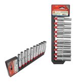 JOGO DE SOQUETE LONGO ESTRIADO 10 PEÇAS - Dimensões da Peça: - 8 Soquetes: 2 x 2 x 7,8cm - 1 Soquete: 2,3 x 2,3 x 7,8cm - 1 Soquete: 2,6 x 2,6 x 7,8cm - Dimensões da Embalagem: 11 x 3 x 33cm - Quantidade Inner: 5 Peças - Dimensões Inner: 13 x 34,5 x 13,5cm - Quantidade Master: 10 Peças - Dimensões Master: 36 x 27 x 32m - Material: Aço cromado vanádio - Cor: Prata - Tipo de Embalagem: Suporte - Marca: Corneta - Origem: Fabricado na China sob supervisão técnica Corneta Ferramentas do Brasil - Contém: 10 unidades - Tamanhos: - 8 - 10 - 11 - 12 - 13 - 14 - 15 - 16 - 17 - 19mm. Garantia do produto: 90 dias de garantia de acordo com o Código de Defesa do Consumidor + a Garantia do Fabricante