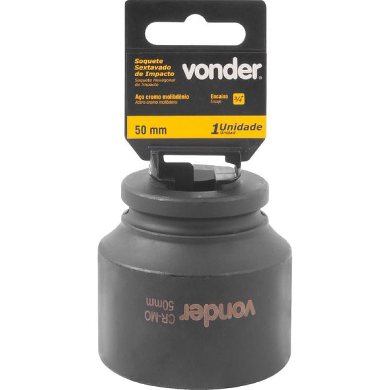 "Ref. Fornecedor:3061340050Marca:VonderConteúdo da Embalagem:1 SoqueteDestaques e diferenciais:Produzido em aço cromo molibdênio, proporcionando maior resistência e durabilidade. Possui acabamento fosfatizado que confere maior proteção contra a oxidação/corrosão.Aplicações e dicas de uso:Indicado para fixar e soltar porcas e parafusos sextavados com o auxílio de chaves de impacto pneumáticas e elétricas.Características Técnicas:Material do soquete: Aço cromo molibdênio Acabamento do soquete: Fosfatizado Medida do encaixe quadrado do soquete: 3/4"" Medida do soquete sextavado (mm): 50,0 mm"