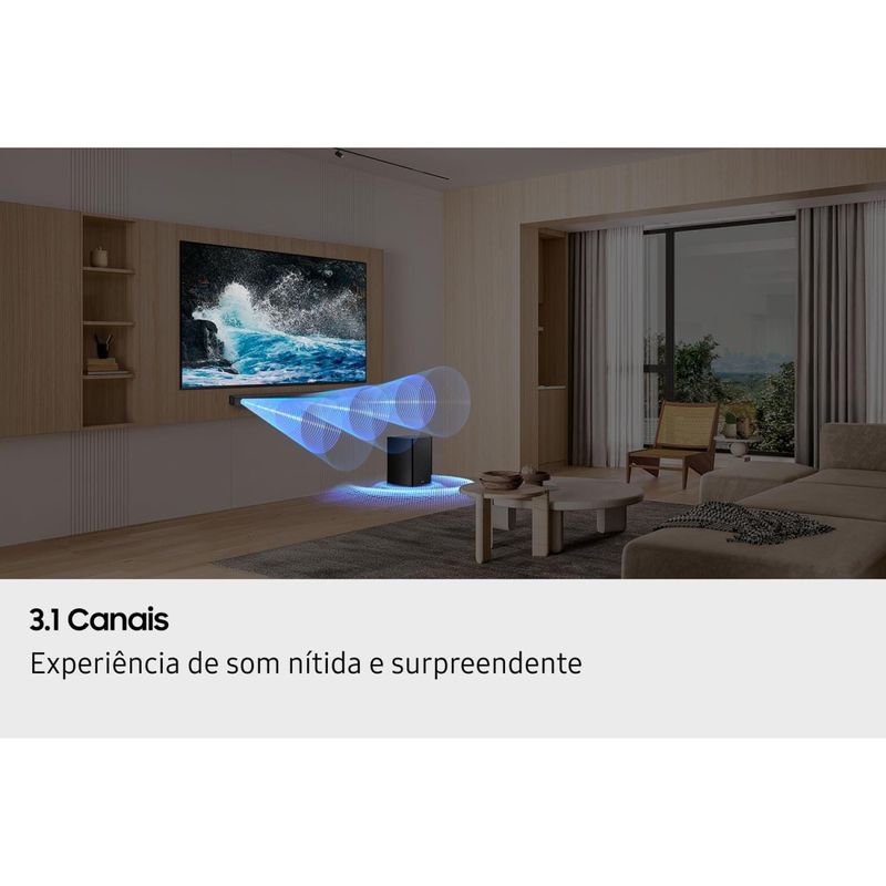 Soundbar Samsung HW-B450F – uma experiência de som nítida e surpreendente! Eleve o som da sua TV com a Soundbar Samsung HW-B650F/ZD. Com potência total de 370W e sistema de 3.1 canais, capaz de entregar uma experiência sonora envolvente e detalhada para filmes, séries, jogos e músicas.SubwooferCom subwoofer sem fio e tecnologia Bass Boost, você sente cada batida com graves intensos e definidos. Já o Dolby Audio e o DTS Virtual:X criam um som tridimensional e cinematográfico que preenche todo o ambiente.Som AdaptávelA função Q-Symphony sincroniza a TV e a soundbar para trabalharem em perfeita harmonia, proporcionando um som integrado e equilibrado. Além disso, o Som Adaptável ajusta automaticamente o áudio conforme o conteúdo, enquanto o Modo Jogo intensifica os efeitos sonoros para uma experiência imersiva. BluetoothCom Bluetooth 4.2 e reprodução via USB, a conectividade é prática e versátil. A soundbar também conta com entrada e saída HDMI (ARC) e entrada óptica, garantindo compatibilidade com diversos dispositivos.O design moderno em Preto combina com qualquer ambiente, e o controle remoto incluso proporciona total conveniência para ajustar o som conforme sua preferência. Potência de 370W com 3.1 canais Subwoofer sem fio com graves potentes Dolby Audio e DTS Virtual:X com som 3D Q-Symphony: som em sincronia com a TV Bluetooth 4.2 e reprodução via USB Modos Som Adaptável, Jogo e Bass Boost Soundbar Samsung HW-B650F/ZD: som de cinema, conectividade total e design elegante para sua casa.Descubra mais produtos com a tecnologia Samsung!