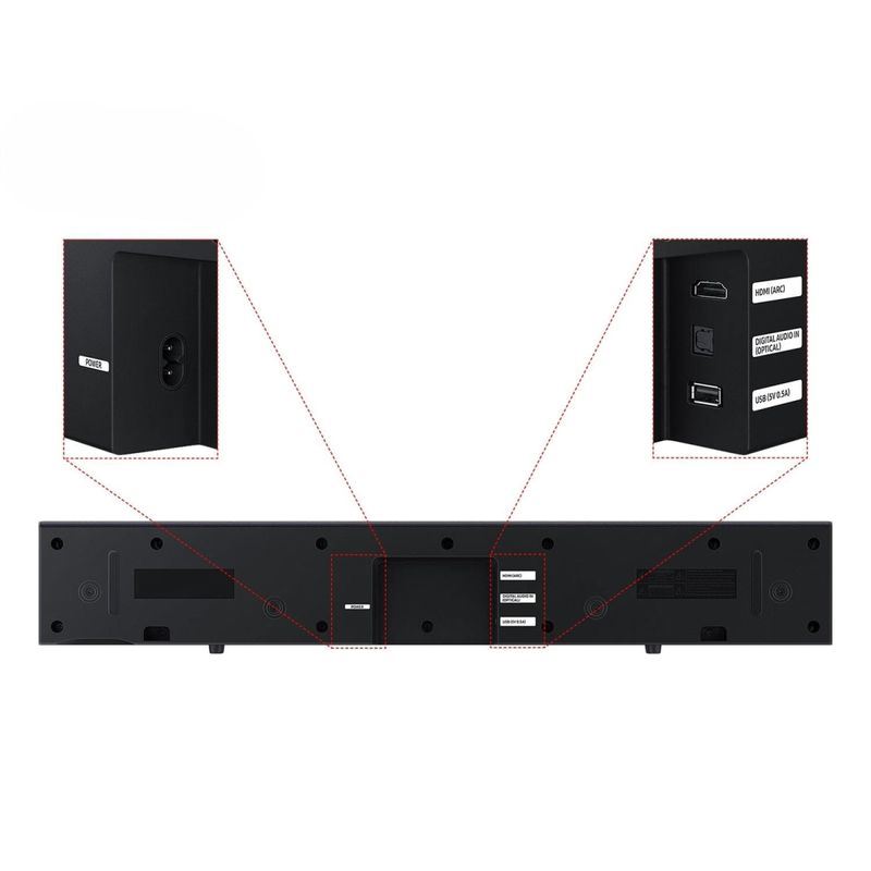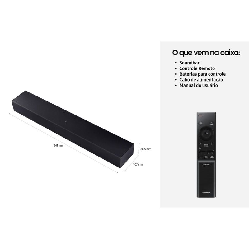 Soundbar Samsung HW-B400F/ZD – Para desfrutar cada som com potência e elegância! A Soundbar Samsung HW-B400F/ZD. Compacta e elegante, perfeita para transformar o áudio da sua TV, entregando nitidez, graves intensos e conectividade moderna.PotênciaCom 40W RMS de potência distribuídos em 2.0 canais e woofer integrado, o modelo oferece uma experiência de som envolvente e bem definida, perfeita para filmes, séries e músicas. Bluetooth 4.2A tecnologia Bluetooth 4.2 garante uma conexão estável e prática com a TV ou outros dispositivos compatíveis, eliminando fios e simplificando o uso. Além disso, você pode reproduzir músicas diretamente via USB ou conectar sua TV por HDMI (ARC) e entrada óptica para máximo desempenho sonoro. Som Surround com modo de Extensão de Som para maior imersão Design moderno na cor Titan Black que combina com qualquer ambiente Compatibilidade com diversos formatos: MP3, AAC, FLAC, WAV Fácil instalação e operação com controle remoto incluso Compacta, leve e eficiente, a Soundbar HW-B400F/ZD entrega som de qualidade, tecnologia e estilo no mesmo produto.Descubra mais produtos com a tecnologia Samsung!