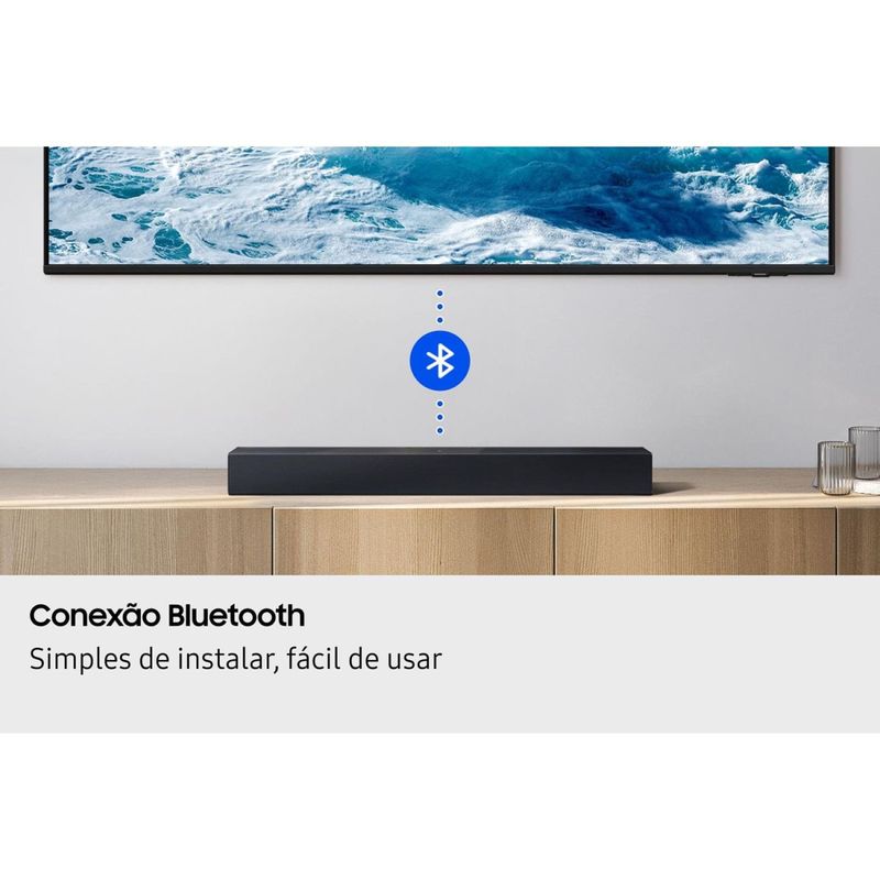 Soundbar Samsung HW-B400F/ZD – Para desfrutar cada som com potência e elegância! A Soundbar Samsung HW-B400F/ZD. Compacta e elegante, perfeita para transformar o áudio da sua TV, entregando nitidez, graves intensos e conectividade moderna.PotênciaCom 40W RMS de potência distribuídos em 2.0 canais e woofer integrado, o modelo oferece uma experiência de som envolvente e bem definida, perfeita para filmes, séries e músicas. Bluetooth 4.2A tecnologia Bluetooth 4.2 garante uma conexão estável e prática com a TV ou outros dispositivos compatíveis, eliminando fios e simplificando o uso. Além disso, você pode reproduzir músicas diretamente via USB ou conectar sua TV por HDMI (ARC) e entrada óptica para máximo desempenho sonoro. Som Surround com modo de Extensão de Som para maior imersão Design moderno na cor Titan Black que combina com qualquer ambiente Compatibilidade com diversos formatos: MP3, AAC, FLAC, WAV Fácil instalação e operação com controle remoto incluso Compacta, leve e eficiente, a Soundbar HW-B400F/ZD entrega som de qualidade, tecnologia e estilo no mesmo produto.Descubra mais produtos com a tecnologia Samsung!