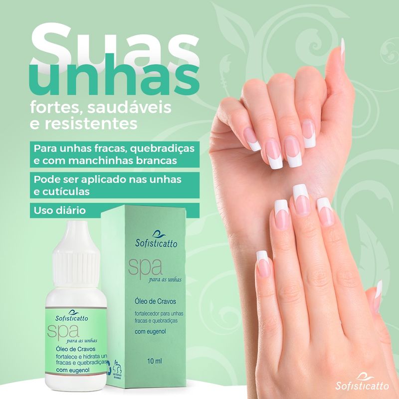 Spa Óleo de Cravo Fortalecedora de Unhas 10mL - SofisticattoFortaleça suas unhas deixando-as saudáveis e resistentes. Para unhas fracas, quebradiças e com manchinhas brancas.*Manchinhas brancas que são causadas por micro lesões como bater as unhas em superfície plana. Pode ser aplicado nas unhas e cutículas. Uso diário. Marca: SofisticattoEmbalagem: 1 - Spa Óleo de Cravo Fortalecedora de Unhas 10mL