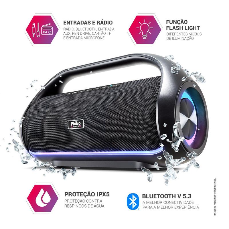 Deixe suas comemorações mais animadas e festivas com o Speaker Philco PBS220BT Extreme Bluetooth 220W. São até 14 horas de duração da bateria interna e ela ainda é recarregável. Aliado a essa vantagem, o speaker é bivolt, portátil e possui alça para facilitar o transporte. Com isso, você pode leva-lo para onde quiser, a qualquer hora. O speaker possui diversos tipos de entradas e acesso via Bluetooth, o que aumenta a conectividade do aparelho com demais dispositivos. Desse modo, mais os 220W de potência, a diversão é garantida. Todas essas vantagens são acompanhadas pela Função Flash Lights, que permite a mudança das cores exibidas pelo Speaker, enquanto você escuta suas músicas preferidas. Aproveite de todos os benefícios que o Speaker Philco PBS220BT Extreme Bluetooth 220W pode te trazer e eleve a qualidade performance do som aos escutar seus áudios no ambiente. • Potência 220W RMS • Bluetooth 5.3 • 2 woofers 3,5 polegadas • Flash light • Bateria interna de Li-ion, 3,7V 4500mAh • Rádio FM; • Memória para gravar estações de rádio; • USB: Entrada USB para reprodução de músicas; • Entrada auxiliar de áudio /AUX IN (P2); • Entrada para cartão de memória TF até 64Gb • Entrada para microfone; • Entrada USB-C para carregamento; • Função TWS • LED indicador de carga de bateria; • LED indicador de conexão Bluetooth; • Função EX Bass • Proteção IPX 5.