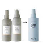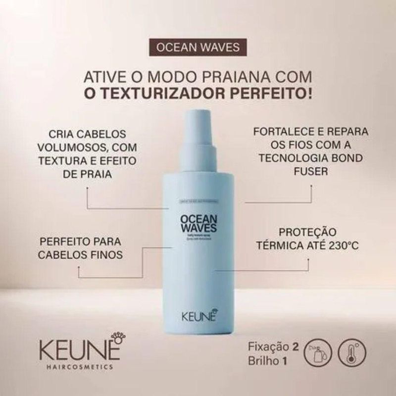 Spray Texturizador Ocean Waves Style Keune 200mlVersão atualizada do Salt Mousse e Salt Mist, Ocean Waves é o spray texturizador que dá ao seu cabelo o efeito de praia perfeito! Com sal marinho para textura e volume, confere um acabamento sem brilho e proteção térmica até 230°C. Ideal para todos os comprimentos e, em especial os cabelos finos, é a escolha certa para ondas de praia cheias de estilo.Ocean Waves é o spray texturizador de sal perfeito para quem ama aquele efeito de cabelo de praia que nunca sai de moda. Ele não só proporciona a textura e o volume desejados, como também repara e protege os fios, garantindo uma proteção térmica de até 230°C. O sal marinho presente na fórmula dá aderência e textura aos fios, criando um volume natural com um acabamento sem brilho. Ideal para todos os comprimentos de cabelo, especialmente os mais finos, Ocean Waves é a escolha certa para quem quer destacar o cabelo com um look praiano autêntico e cheio de estilo. Possui a exclusiva Tecnologia Bond Fuser, que protege as pontes dissulfeto existentes e forma novas pontes, mantendo a integridade dos fios.Modo de usar:Borrife no cabelo úmido ou seco e seque com secador para dar bastante volume. Aplique o produto em camadas para customizar o volume e aderência.Resultado: Cabelos volumosos e com efeito de praia.