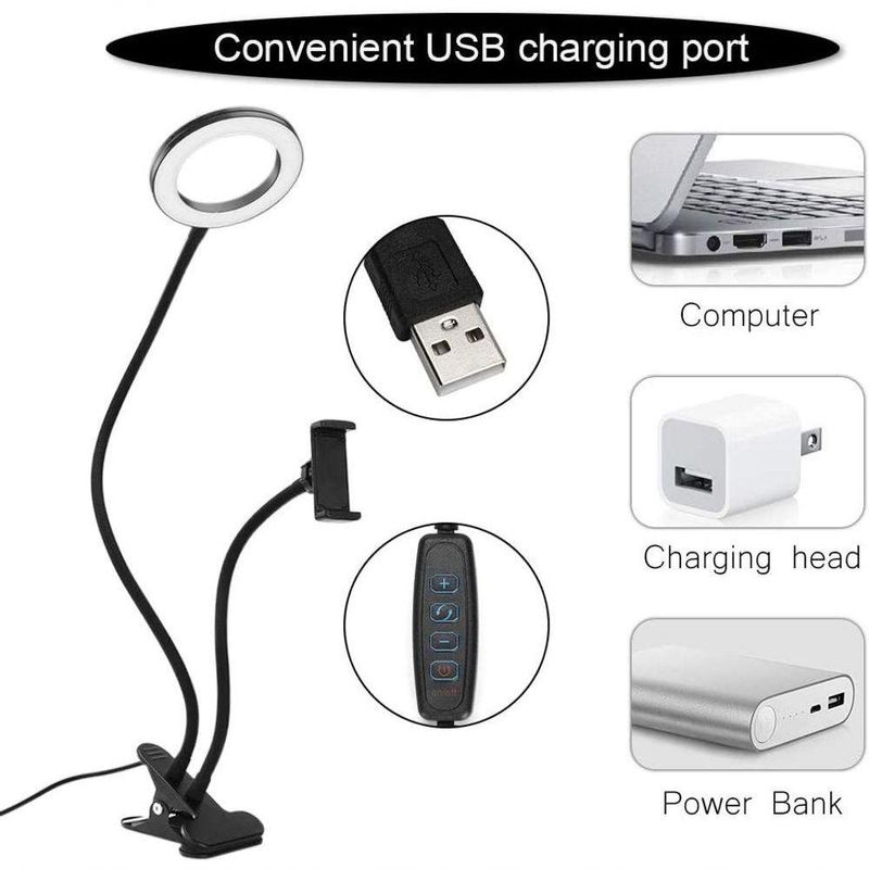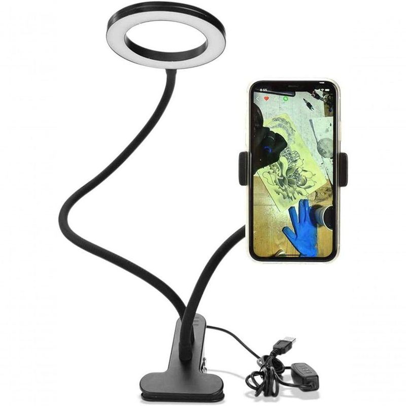 Sunbaca Clip On Led Selfie Ring Light Com Suporte Para Telefone Celular Garra 2 Em 1Recursos:Prenda a mesa / mesa / cama para liberar as mãos. Lâmpada rotativa de 360 graus e suporte para telefone, sinta-se à vontade para ajustar-se a qualquer ângulo que desejar para uma revisão conveniente, tirar fotos ou gravar vídeos.3 Cor da luz: luz fria, luz fria e quente, luz quente. O design da luz led com 10 brilho ajustável atende a todas as suas necessidades em diferentes circunstâncias.Ele será útil sempre que você precisar de luz extra para maquiagem, tirar fotos, gravar vídeos, ler livros e transmitir ao vivo.A largura deste suporte para celular é de 2,8 polegadas no mínimo a 3,7 polegadas no máximo e será compatível com a maioria dos telefones inteligentes.A porta USB funciona com vários dispositivos. Você poderá desfrutar livremente da lâmpada e do suporte do telefone celular a qualquer momento.Especificações:Tipo: Anel de Luz para SelfieMaterial: ABS + MetalCor pretaComprimento total do suporte: 63,5 cm / 25 polTamanho da lâmpada: Diâmetro externo 10.8cm / 4.3inTamanho do pacote: 17.3 * 14.7 * 8cm / 6.8 * 5.8 * 3.1inPeso do Pacote: 525g / 18.5ozLista de Pacotes:1 * luz anel selfie