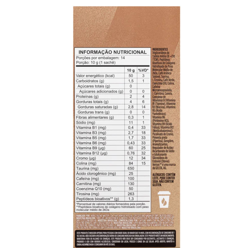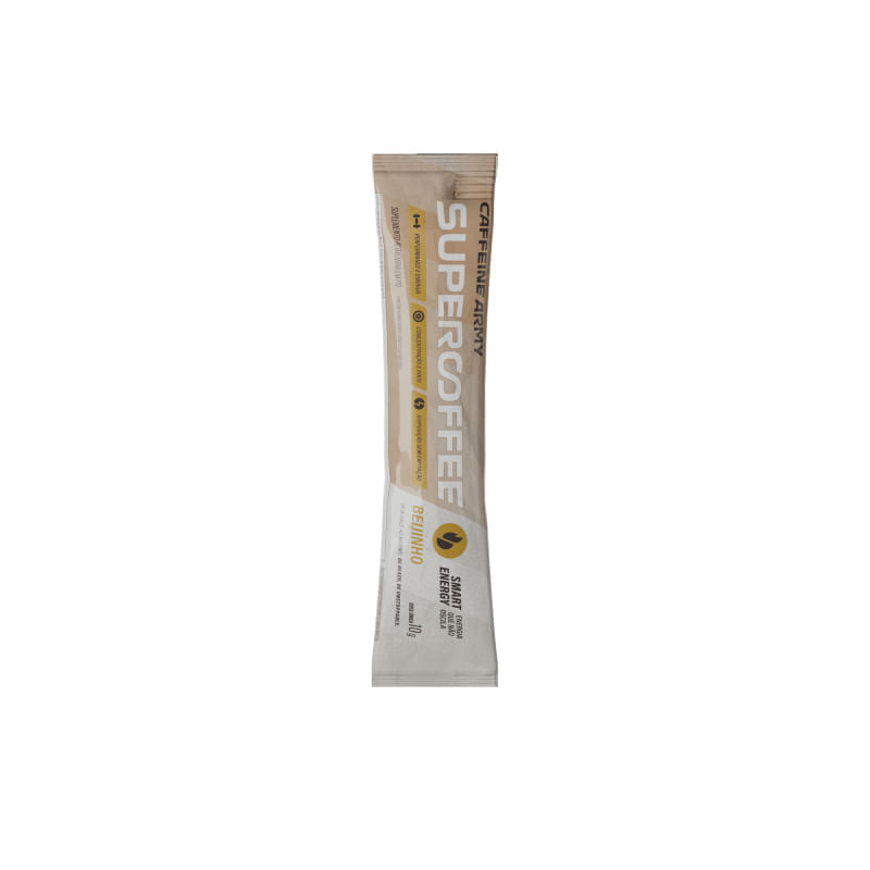 O SuperCoffee 3.0 sabor beijinho Caffeine Army, é uma bebida energética e funcional elaborada com um blend de ingredientes naturais exclusivamente combinados para proporcionar um boost de energia para o corpo e a mente. Essa versão em sachê oferece uma dose única e possui preparo super prático, além de ser fácil de levar para qualquer lugar. Sobre os ingredientes: TCM C8 E C10: ajudam gerar energia para o corpo e mente, aumentar a saciedade e boa digestão. CoQ10: tem ação antioxidante e atua na geração de energia celular. Colágeno Verisol®: uma proteína que atua na saúde da pele, cabelos e unhas. Ajuda a melhorar a elasticidade e firmeza da pele. Café verde: fonte de ácido clorogênico, possui ação antioxidante e termogênica. Sugestão de consumo: Em uma xícara, misture 1 sachê (10g) com água quente (100ml). É recomendado o consumo de até 2 doses diárias. Usar 30 minutos antes da atividade física ou cognitiva ou em jejum ao acordar. Motivos para escolher o produto: Pode ser consumido antes do exercício ou estudos; Contém colágeno Verisol®; Elaborado com cafeína Timerelease (Microencapsulada); 50g de Coenzima Q10 na porção; 650mg de Taurina na porção; Fornece energia que não oscila; Enriquecido com vitaminas do complexo B; Sem adição de açúcar. A Marca A Caffeine Army nasceu em 2016 com o propósito de despertar as melhores versões que já existem dentro de nós mesmos. Não representa apenas o início de uma marca, mas sim a construção de uma comunidade engajada, unida e imparável, que compartilha do mesmo desejo incessante em evoluir 1% a cada dia. Tudo isso por transformar um estilo de vida em propósito, com o desejo de levar adiante a mudança que uma rotina de saúde, bem-estar e alta performance pode causar.