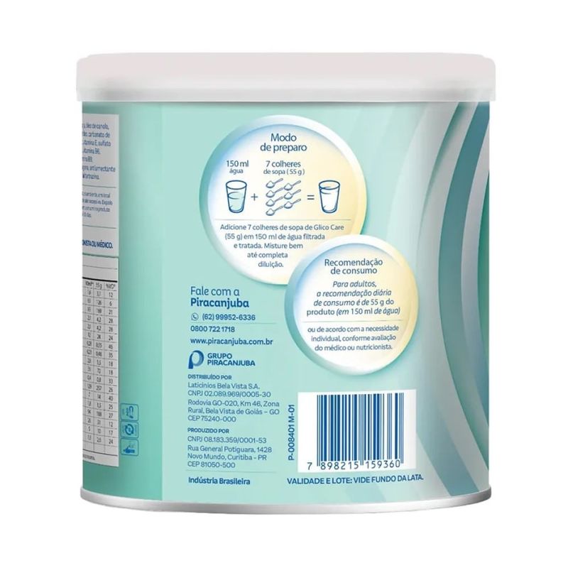 Suplemento Alimentar Piracanjuba Excellence Glico Care 740g O Suplemento Alimentar Excellence Glico Care foi desenvolvido especialmente para auxiliar o controle glicêmico de adultos diabéticos ou pré-diabéticos (19+). Com uma fórmula nutricionalmente completa e sabor baunilha, ele prova que cuidar da saúde pode ser uma experiência saborosa e prazerosa.Sua composição apresenta um perfil de carboidratos controlado e baixo teor de açúcares, sendo fortificado com proteínas, fibras e Ômega 3. Além de contribuir para o equilíbrio metabólico, o Glico Care oferece suporte energético através das vitaminas B6 e B12, tornando o dia a dia de quem precisa controlar a glicemia muito mais leve, prático e saudável. Características Controle Glicêmico: Baixo teor de açúcares e carboidratos controlados para dietas restritivas. 15g de Proteína: Auxilia na manutenção da massa muscular e promove saciedade. Rico em Fibras (3,1g): Contribui para a saúde digestiva e auxilia no controle da glicose. Ômega 3: Ação anti-inflamatória e suporte à saúde cardiovascular. Metabolismo Ativo: Com Cromo, B6 e B12 para otimizar o metabolismo de carboidratos e gorduras. Modo de Preparo Adicione 7 colheres de sopa do produto (aprox. 55g) em aproximadamente 150ml de água filtrada e tratada. Misture vigorosamente até a completa diluição do pó. Pode ser consumido como complemento alimentar em diferentes momentos do dia. Ingredientes e Diferenciais Foco Metabólico: Cromo para auxílio no metabolismo de proteínas e gorduras; Vitaminas do complexo B para energia celular.Sabor: BaunilhaConteúdo: Lata de 740g Informação Nutricional Porção de 55g (7 Colheres de Sopa) ITEM QTDE. POR PORÇÃO OBJETIVO Proteínas 15g Massa Muscular Fibras Alimentares 3,1g Saúde Digestiva Ômega 3 Presente Cardiovascular Advertências: Contém aromatizante sintético idêntico ao natural. Este produto não é um medicamento. Manter fora do alcance de crianças. Conservar em local seco e arejado, protegido da luz e da umidade.