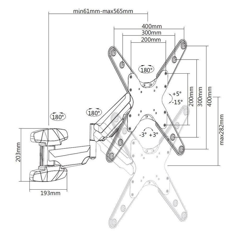 Suporte Articulado para TV 23 a 55 Ajuste de Altura F450N - Ref: F450N O suporte articulado de parede F450N da Central Suportes, possui um sistema de braço articulado com pistão a gás, o qual possibilita diversos ajustes e movimentos de forma leve e prática. É compatível com televisores LCD / LED / PLASMA / 3D / OLED / QLED de 23 a 55 polegadas, que possuam padrões de fixação VESA 100x100, 200x100, 200x200, 300x300, 400x200, 400x300 e 400x400mm, presentes na traseira das telas e peso entre 5Kg a 30Kg. ** Este suporte pode atender a TVs de 65”, desde que estejam dentro do limite de peso e padrão de furação VESA compatível.** O suporte F450N é fabricado em alumínio injetado de alta resistência, com acabamento de alto padrão. Possui capa plástica no braço do suporte, para passagem e organização dos cabos. Por ser um suporte full motion, ou seja, gira e inclina em diversas direções, pode cobrir praticamente todos os pontos de visualização do ambiente, ideal para entretenimento, videoconferência ou jogos. ATENÇÃO * Não é compatível com o VESA 300x200mm ** O peso da TV deve estar obrigatoriamente na faixa de 5 (mínimo) até 30Kg (máximo). *** TVs com peso inferior a 5kg vão ficar abaixo do peso mínimo e o pistão a gás ficará sempre na altura máxima do suporte. **** TVs com peso superior a 30kg vão ficar acima do peso máximo e o pistão interno não conseguirá manter a altura desejada. OBSERVAÇÃO * Acompanha parafusos compatíveis com o padrão M8x45mm adequado para as novas TVs Samsung. ** Este suporte não pode ser instalado na posição invertida ( de cabeça para baixo ). CARACTERÍSTICAS :: Tipo de TV: LED, LCD, PLASMA. :: Tamanhos Suportados: 23 a 55 Polegadas. :: Carga máxima (Peso do aparelho) 5Kg a 30Kg. :: Padrão de fixação VESA 100x100, 200x100, 200x200, 300x300, 400x200, 400x300 e 400x400mm ( HxV ). :: Fabricado em Alumínio injetado e aço carbono. :: Tratamento anti-corrosão e pintura epóxi eletrostática. :: Cor: PRETO. :: Tipo de Suporte: Articulado. :: Ajuste vertical: Sistema de movimentação vertical com pistão a gás ( 28,2 cm ). :: Giro horizontal da tela: Até 180° (Esquerda / Direita - Limitado ao tamanho da tela da TV). :: Ajuste de inclinação frontal (TILT): Até +5° / -15° ( para baixo ou para cima ). :: Ajuste de inclinação lateral: Até +3° / -3°. :: Distância da Parede: Mínima: até 6,1cm (Braços recolhidos) e Máxima: até 56,5cm (Braços esticados). *** VESA é a distância horizontal e vertical entre os centros dos furos, para fixação de suportes, na traseira dos televisores. EXTRAS :: Já vem pré-montado, pronto para instalação. :: Pistão de gás e juntas desenvolvidos para fornecer movimentos suaves e estáveis. :: Desenvolvido para melhorar sua experiência de visualização. :: Organizador de cabos. :: Design compacto e retrátil que economiza espaço. OBSERVAÇÕES * Vida útil do pistão a gás é de aproximadamente 21.000 ciclos. ** Os parafusos fornecidos no kit de acessórios do produto estão de acordo com os padrões mais comuns dentre aqueles utilizados pelos principais fabricantes de LCD / LED do mercado, porém podem haver exceções quanto à compatibilidade dos mesmos. Garantia: - 1 ano junto ao fabricante