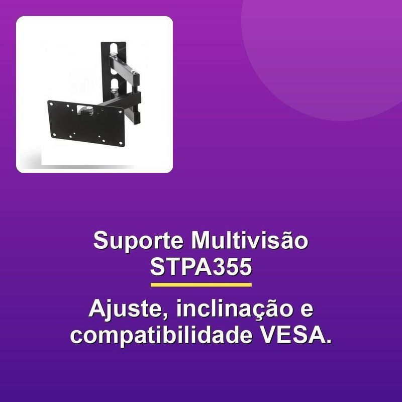 Suporte Articulado Tv Multivisão 14-56 Stpa355O Suporte Articulado Para TV 14-56 STPA355 Multivisão é um dispositivo versátil e prático projetado para TVs LCD/LED/3D, oferecendo uma solução conveniente para a montagem da sua TV na parede. Com um sistema de fixação VESA, é compatível com padrões de montagem de 75mm, 100mm, 200mm, 300mm e 400mm, o que significa que você pode facilmente ajustá-lo para se adequar à maioria dos modelos de TV disponíveis no mercado.A inclinação ajustável do suporte permite que você encontre o ângulo perfeito de visualização, com opções de inclinação de 0°, 6° e 15°. Você pode adaptar a posição da TV de acordo com suas preferências pessoais, garantindo uma visualização confortável em qualquer ambiente. Além disso, o Suporte Articulado oferece uma distância da parede flexível, variando de 60mm a 400mm, permitindo que você posicione a TV de forma precisa e adequada.Com uma capacidade de carga de até 35kg de peso, o Suporte Articulado é capaz de suportar com segurança e confiança a maioria das TVs de tamanhos médios e grandes. A cor preta dá um toque de elegância e sofisticação ao seu ambiente, tornando-o perfeito para qualquer sala ou espaço disponível.O Suporte Articulado Para TV 14-56 STPA355 Multivisão é um dispositivo versátil e prático projetado para TVs LCD/LED/3D, oferecendo uma solução conveniente para a montagem da sua TV na parede. Com um sistema de fixação VESA, é compatível com padrões de montagem de 75mm, 100mm, 200mm, 300mm e 400mm, o que significa que você pode facilmente ajustá-lo para se adequar à maioria dos modelos de TV disponíveis no mercado.A inclinação ajustável do suporte permite que você encontre o ângulo perfeito de visualização, com opções de inclinação de 0°, 6° e 15°. Você pode adaptar a posição da TV de acordo com suas preferências pessoais, garantindo uma visualização confortável em qualquer ambiente. Além disso, o Suporte Articulado oferece uma distância da parede flexível, variando de 60mm a 400mm, permitindo que você posicione a TV de forma precisa e adequada.Com uma capacidade de carga de até 35kg de peso, o Suporte Articulado é capaz de suportar com segurança e confiança a maioria das TVs de tamanhos médios e grandes. A cor preta dá um toque de elegância e sofisticação ao seu ambiente, tornando-o perfeito para qualquer sala ou espaço disponível.