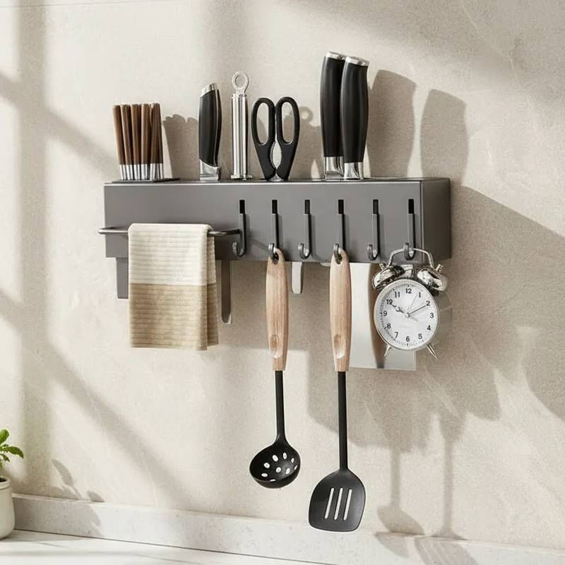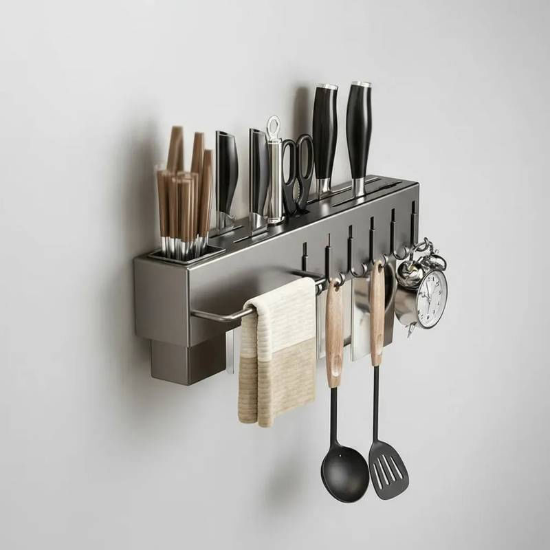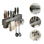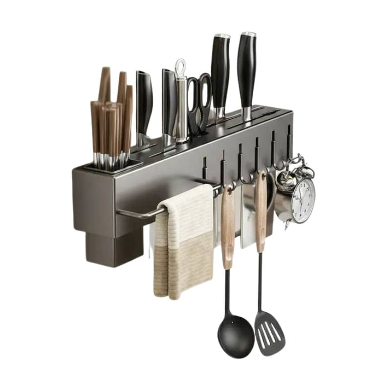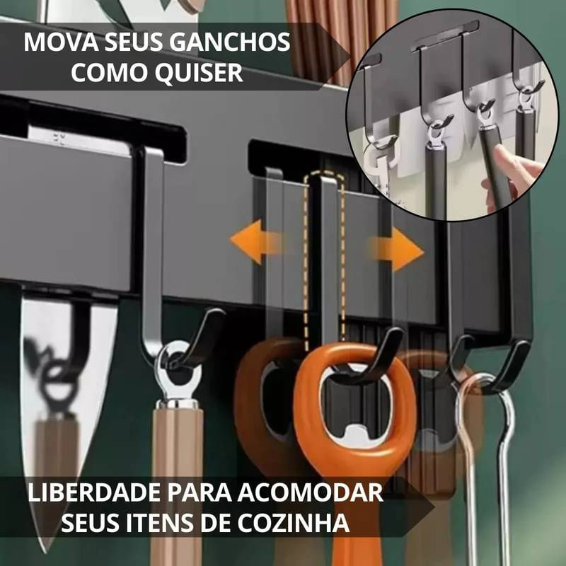 Suporte Cinza Organizador Utensílios de Cozinha 06 Ganchos ===================================== Com um design moderno, elegante e super resistente, este suporte é fabricado em aço inox de alta qualidade, garantindo durabilidade, resistência à corrosão e facilidade na limpeza, para você ter um produto que acompanha o dia a dia da sua cozinha sem perder a beleza. Ele conta com compartimentos especiais para armazenar facas, talheres, espátulas, tesouras, tábuas de corte e muito mais, promovendo uma organização inteligente que facilita o preparo das suas receitas. Além disso, possui diversos ganchos resistentes para pendurar utensílios, abridores, escumadeiras e outros acessórios, otimizando cada centímetro do seu espaço. A barra lateral serve como suporte para pendurar toalhas, garantindo praticidade e higiene no manuseio dos utensílios. A instalação é simples e rápida, feita com sistema de encaixe que não danifica a parede e dispensa o uso de ferramentas complexas, permitindo que você monte seu organizador em poucos minutos e sem complicações. ===================================== Contém: 01 Organizador Kit para Instalação Especificações: - Material: Metal - Medida: 39,5cm x 5,3cm x 6,5cm - Ganchos Móveis - Porta Talher Removível - Peso: 450 gramas - Cor: Cinza Escuro ===================================== Devido à diferença entre monitores e iluminação diferentes, pode haver variação na tonalidade apresentada no anúncio. Medidas muito aproximadas.