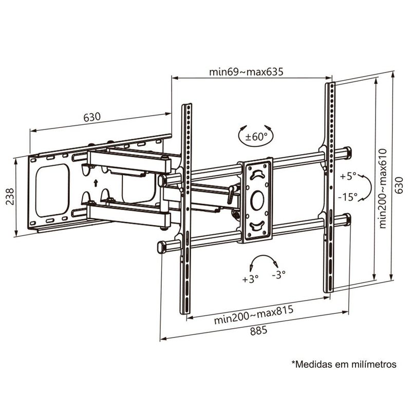 Suporte TV Articulado 55 a 90 A02V8XL ELG Telas Gigantes - Modelo: A02V8XL COMPATIBILIDADE DO SUPORTE ARTICULADO A02V8XL PARA TELEVISÃO Este Suporte para Televisão Articulado é indicado para modelos LCD / LED / PLASMA / 3D / OLED / QLED / Curvas com peso de até 75kg e compatíveis com padrão de fixação VESA 200x200, 200x300, 300x200, 300x300, 400x200, 400x300, 400x400, 600x200, 600x400, 800x200, 800x400 ou 800x600 mm (HxV), normalmente encontrado em televisores de 55 a 90 polegadas. * Acompanha parafusos compatíveis com o padrão M8x50mm adequado para as novas TVs Samsung. CARACTERÍSTICAS DO SUPORTE ARTICULADO - Funções: Avanço / Recuo da tela; - Giro horizontal: Até 60º (Esquerda / Direita - Limitado ao tamanho da tela da TV); - Ajuste de inclinação: Até 5º para cima e 15º para baixo; - Inclinação lateral (Correção de Nível): +/- 3º. DISTÂNCIA DA PAREDE - Distância Mínima: 6,9 cm (Braços recolhidos); - Distância Máxima: 63,5 cm (Braços esticados). EXTRAS - Movimentos leves e precisos para melhor posicionamento da TV; - Acompanha exclusivo nível bolha magnético; - Parafuso extralongo M8x50 para TVs Samsung - Organizador de cabos; - Trava de segurança. LOCAL DE INSTALAÇÃO - Alvenaria (parede de tijolo ou bloco); - Painel de madeira / MDF. IMPORTANTE SOBRE A INSTALAÇÃO * Este suporte para televisão articulado pode ser instalado em alvenaria ou painel, lembrando que a superfície de instalação precisa ser forte para resistir ao peso combinado da tv mais o suporte; ** Para instalar na madeira normalmente é necessário usar parafusos adequados à espessura da chapa. DADOS TÉCNICOS - Material: Aço Carbono; - Acabamento: Tratamento Anticorrosão e pintura Epóxi Eletrostática. ATENÇÃO * Verifique se o espaço deixado pelo suporte articulado entre a TV e a parede é suficiente para passagem e acomodação dos cabos de áudio, vídeo e energia; ** Verifique o padrão de furação de sua TV antes de comprar o suporte articulado. Características Gerais do Produto: • Padrão VESA (mm): 200x200; 200x300; 300x200; 300x300; 400x200; 400x300; 400x400; 600x200; 600x400; 800x200; 800x400; 800x600 • Tamanho da Tela: De 55" a 90" • Peso Suportado: Máximo 75kg • Local de Instalação: Parede / Painel Acompanha o produto: • Suporte Multiarticulado para TV • Kit de acessórios para instalação do suporte na parede • Kit de acessórios p/instalação da TV no suporte • Manual de instalação Garantia: • 3 anos junto ao fabricante