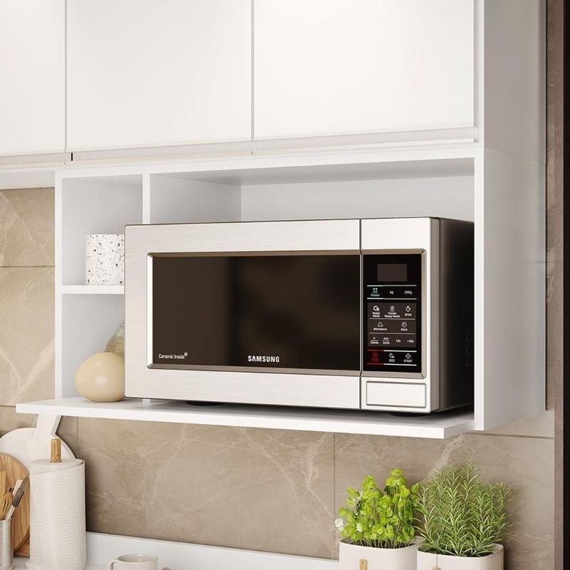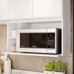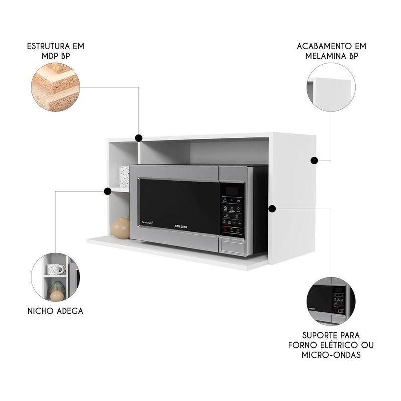 Suporte Microondas Aéreo 81cm Com Nicho Adega Miami Branco - LumilSuporte Microondas Aéreo 81cm com Nicho Adega Miami Branco - LumilPrecisa de um móvel que traga praticidade e beleza para sua Cozinha? Esse Armário Aéreo é a escolha ideal para unir funcionalidade e estilo em um único produto. Perfeito para quem busca otimizar o espaço, ele serve como suporte para Micro-ondas ou forno elétrico, além de contar com nichos laterais que podem ser usados para decoração ou como adega com capacidade para até duas garrafas, deixando tudo sempre ao alcance das mãos. Fabricado em estrutura resistente e com acabamento moderno, esse móvel garante durabilidade e elegância, combinando facilmente com diferentes estilos de decoração. Com design versátil e funcional, este Armário de Cozinha é ideal para quem deseja praticidade sem abrir mão da sofisticação no ambiente. Dimensões do Produto Largura: 81 cm. Altura: 42 cm. Profundidade: 42 cm. Peso: 8,5 kg. Outras Medidas Largura do Nicho Adega: 17,5 cm. Largura Nicho Micro-ondas: 59 cm. Características do Produto Material da estrutura: MDP BP. Acabamento: Melamina BP. Escala de Brilho: Fosco. Peso Suportado: 20 kg distribuídos. Possui Prateleiras: Não. Possui Nichos: Sim. Quantidade de Nichos: 3 Nichos. Diferenciais: - Design moderno. - Nicho adega na lateral. - Suporte suspenso para forno elétrico ou micro-ondas. Sistema de Montagem: Parafusos. Manual de Montagem: Sim. Complexidade da Montagem: Baixa. Volumes: 1 Volume. Conteúdo da Embalagem: 1 Suporte Micro-ondas. Garantia do Fabricante: 90 dias contra defeito de fabricação. Montagem: Recomendamos que seja feita por um profissional. Recomendação de Limpeza: Utilize pano levemente úmido. Observações importantes - Produto para uso residencial em ambiente interno, não devendo ficar exposto diretamente ao sol, calor e umidades excessivas. - Pode haver alguma diferença de tonalidade entre a imagem e o produto real, por conta do tratamento de imagens e a calibração de cores do seu monitor. - As imagens são meramente ilustrativas, não acompanham objetos de decoração e eletrônicos. - Confira o estado da embalagem, não devendo assinar o comprovante em caso de danos. - Não asseguramos, no ato da entrega, por subir escadas/elevadores, pelo transporte por guincho em apartamentos ou montagem, desmontagem e instalações. Eventuais despesas são por conta do comprador. - Confira as dimensões do produto e certifique-se de que passará normalmente por supostos elevadores, portas, escadas e/ou corredores de sua residência. Marca: Lumil Móveis | Modelo: Miami | Inclui manual de montagem: Sim | Tipo de móveis de cozinha: Armário | Requer montagem: Sim | Condição do item: Novo | Produto: Suporte Microondas Aéreo 81cm com Nicho Adega Miami Branco - Lumil | Material: Madeira | Tipo de Material: MDP | Material da Porta: Madeira | Tonalidade: Branco | Cor: Branco | Garantia do Fabricante: 3 | Cômodo Indicado: Cozinhas | Altura da embalagem do vendor: 7 cm | Largura da embalagem do vendor: 81 cm | Peso da embalagem do vendor: 9 kg | Comprimento da embalagem do vendor: 43 cm | É personalizado: Não | Com prateleiras: Não | Nome ML: Suporte Microondas Aéreo 81cm com Nicho Adega Miami Branco | Estilo: Moderno | Quantidade de gavetas: Não se aplica | Is Fragile: false | Baterias são necessárias?: false | Número da peça: 1 | Componentes incluídos: Manual do usuário | Certificação de teste externa: Não | Dimensões do item P x L x A: depth#unit=centimeters;height#unit=centimeters;width#unit=centimeters | Número do modelo: 1 | Regulamentações de produtos perigosos: not_applicable | Principais Características do Produto 0: Montagem: Recomendamos que seja feita por um profissional. | Principais Características do Produto 1: Manual de Montagem: Sim | Principais Características do Produto 2: Garantia do Fabricante: 90 dias | Peso do item: unit=kilograms | Palavras-chave de Pesquisa: Armário Aéreo | Número de caixas: 0