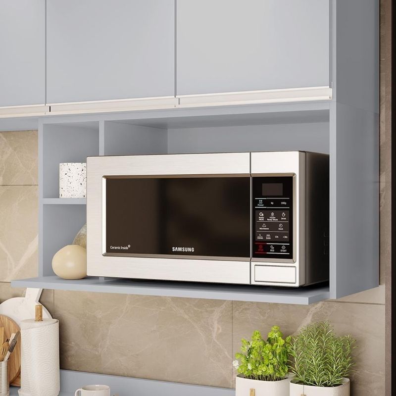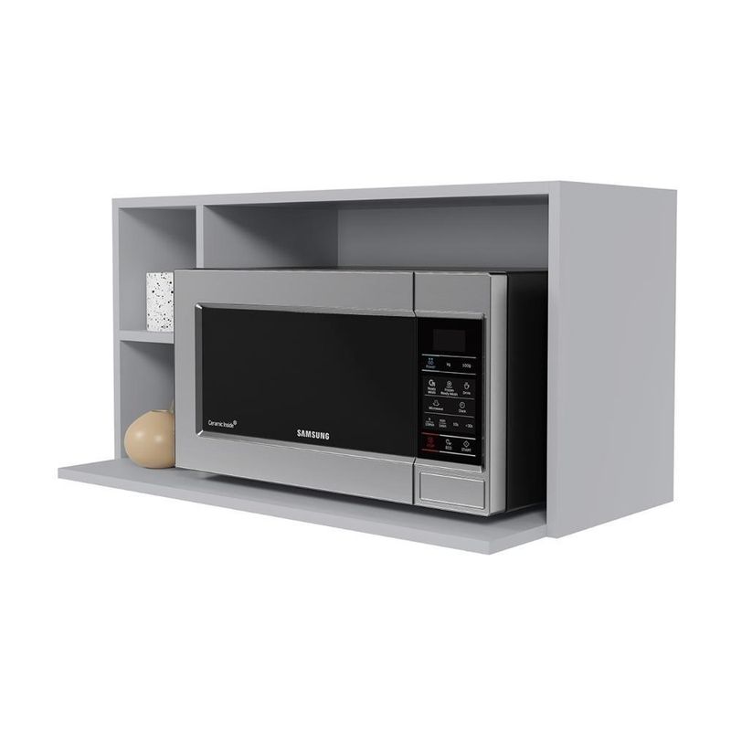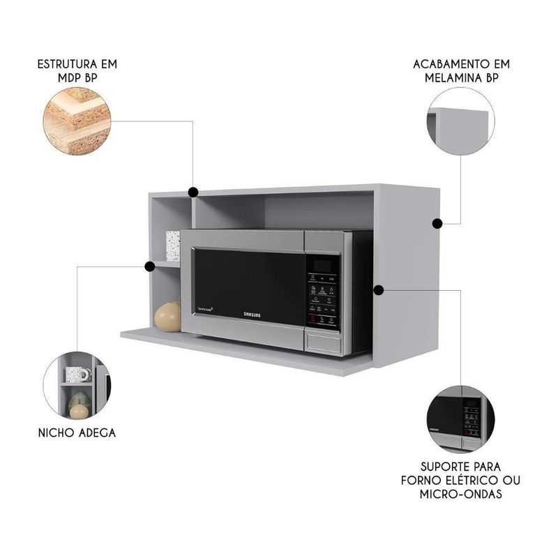 Suporte Microondas Aéreo 81cm Com Nicho Adega Miami Cinza Claro - LumilSuporte Microondas Aéreo 81cm com Nicho Adega Miami Cinza Claro - LumilPrecisa de um móvel que traga praticidade e beleza para sua Cozinha? Esse Armário Aéreo é a escolha ideal para unir funcionalidade e estilo em um único produto. Perfeito para quem busca otimizar o espaço, ele serve como suporte para Micro-ondas ou forno elétrico, além de contar com nichos laterais que podem ser usados para decoração ou como adega com capacidade para até duas garrafas, deixando tudo sempre ao alcance das mãos. Fabricado em estrutura resistente e com acabamento moderno, esse móvel garante durabilidade e elegância, combinando facilmente com diferentes estilos de decoração. Com design versátil e funcional, este Armário de Cozinha é ideal para quem deseja praticidade sem abrir mão da sofisticação no ambiente. Dimensões do Produto Largura: 81 cm. Altura: 42 cm. Profundidade: 42 cm. Peso: 8,5 kg. Outras Medidas Largura do Nicho Adega: 17,5 cm. Largura Nicho Micro-ondas: 59 cm. Características do Produto Material da estrutura: MDP BP. Acabamento: Melamina BP. Escala de Brilho: Fosco. Peso Suportado: 20 kg distribuídos. Possui Prateleiras: Não. Possui Nichos: Sim. Quantidade de Nichos: 3 Nichos. Diferenciais: - Design moderno. - Nicho adega na lateral. - Suporte suspenso para forno elétrico ou micro-ondas. Sistema de Montagem: Parafusos. Manual de Montagem: Sim. Complexidade da Montagem: Baixa. Volumes: 1 Volume. Conteúdo da Embalagem: 1 Suporte Micro-ondas. Garantia do Fabricante: 90 dias contra defeito de fabricação. Montagem: Recomendamos que seja feita por um profissional. Recomendação de Limpeza: Utilize pano levemente úmido. Observações importantes - Produto para uso residencial em ambiente interno, não devendo ficar exposto diretamente ao sol, calor e umidades excessivas. - Pode haver alguma diferença de tonalidade entre a imagem e o produto real, por conta do tratamento de imagens e a calibração de cores do seu monitor. - As imagens são meramente ilustrativas, não acompanham objetos de decoração e eletrônicos. - Confira o estado da embalagem, não devendo assinar o comprovante em caso de danos. - Não asseguramos, no ato da entrega, por subir escadas/elevadores, pelo transporte por guincho em apartamentos ou montagem, desmontagem e instalações. Eventuais despesas são por conta do comprador. - Confira as dimensões do produto e certifique-se de que passará normalmente por supostos elevadores, portas, escadas e/ou corredores de sua residência. Marca: Lumil Móveis | Modelo: Miami | Inclui manual de montagem: Sim | Tipo de móveis de cozinha: Armário | Requer montagem: Sim | Condição do item: Novo | Produto: Suporte Microondas Aéreo 81cm com Nicho Adega Miami Cinza Claro - Lumil | Material: Madeira | Tipo de Material: MDP | Material da Porta: Madeira | Tonalidade: Cinza Claro | Cor: Cinza Claro | Garantia do Fabricante: 3 | Cômodo Indicado: Cozinhas | Altura da embalagem do vendor: 7 cm | Largura da embalagem do vendor: 81 cm | Peso da embalagem do vendor: 9 kg | Comprimento da embalagem do vendor: 43 cm | É personalizado: Não | Com prateleiras: Não | Estilo: Moderno | Nome ML: Suporte Microondas Aéreo 81cm com Nicho Adega Miami Cz Clr | Quantidade de gavetas: Não se aplica | Is Fragile: false | Baterias são necessárias?: false | Número da peça: 1 | Componentes incluídos: Manual do usuário | Certificação de teste externa: Não | Dimensões do item P x L x A: depth#unit=centimeters;height#unit=centimeters;width#unit=centimeters | Número do modelo: 1 | Regulamentações de produtos perigosos: not_applicable | Principais Características do Produto 0: Montagem: Recomendamos que seja feita por um profissional. | Principais Características do Produto 1: Manual de Montagem: Sim | Principais Características do Produto 2: Garantia do Fabricante: 90 dias | Peso do item: unit=kilograms | Palavras-chave de Pesquisa: Armário Aéreo | Número de caixas: 0