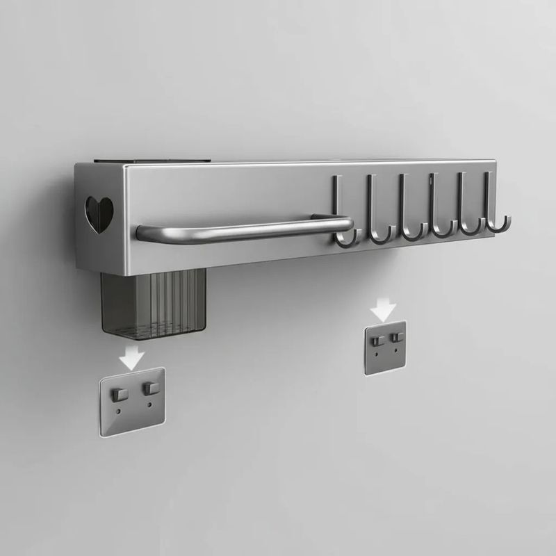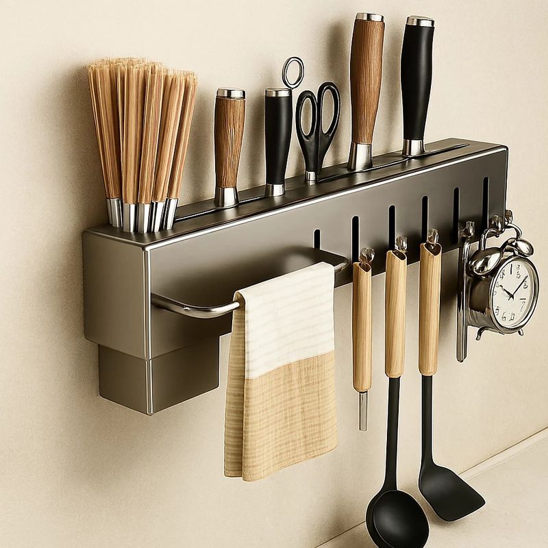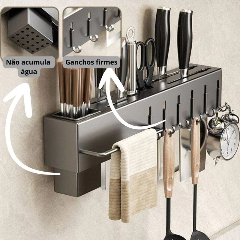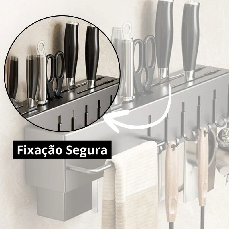 Suporte Organizador Cozinha Parede Aço Inox 6 Ganchos Porta Facas Utensílios Cinza Estrutura em aço inox para resistência à corrosão e durabilidade.Sistema com 6 ganchos móveis para pendurar conchas, escumadeiras e acessórios.Compartimentos integrados para armazenamento vertical de facas, talheres e tesouras.Barra lateral para suporte de toalhas e panos de prato para higiene e fácil acesso.Instalação por sistema de encaixe na parede com buchas e parafusos inclusos. O Suporte Organizador para Utensílios de Cozinha é um rack suspenso multifuncional desenvolvido para otimizar o espaço em bancadas e pias. Fabricado em aço inox com acabamento na cor cinza, o suporte possui alta resistência ao uso diário e facilidade de limpeza. Apresenta divisórias específicas para o acondicionamento de facas e talheres, além de uma barra frontal para pendurar panos de prato.Com 6 ganchos resistentes para pendurar acessórios diversos, o produto promove uma organização inteligente, mantendo os itens ao alcance das mãos durante o preparo de receitas. Suas dimensões compactas (39,5 cm x 5,3 cm x 6,8 cm) permitem a fixação em cozinhas de diferentes tamanhos, utilizando o kit de instalação que acompanha o produto. ESPECIFICAÇÕES TÉCNICASComprimento: 39,5 cmLargura: 5,3 cmAltura: 6,8 cmMaterial: Aço Inoxidável (Metal)Cor: CinzaQuantidade de Ganchos: 6 unidadesPeso: 450gTipo de Instalação: Parede (acompanha buchas e parafusos) CONTEÚDO DA EMBALAGEM1 Suporte Organizador para Utensílios de Cozinha 6 GanchosKit de fixação (parafusos e buchas)