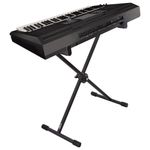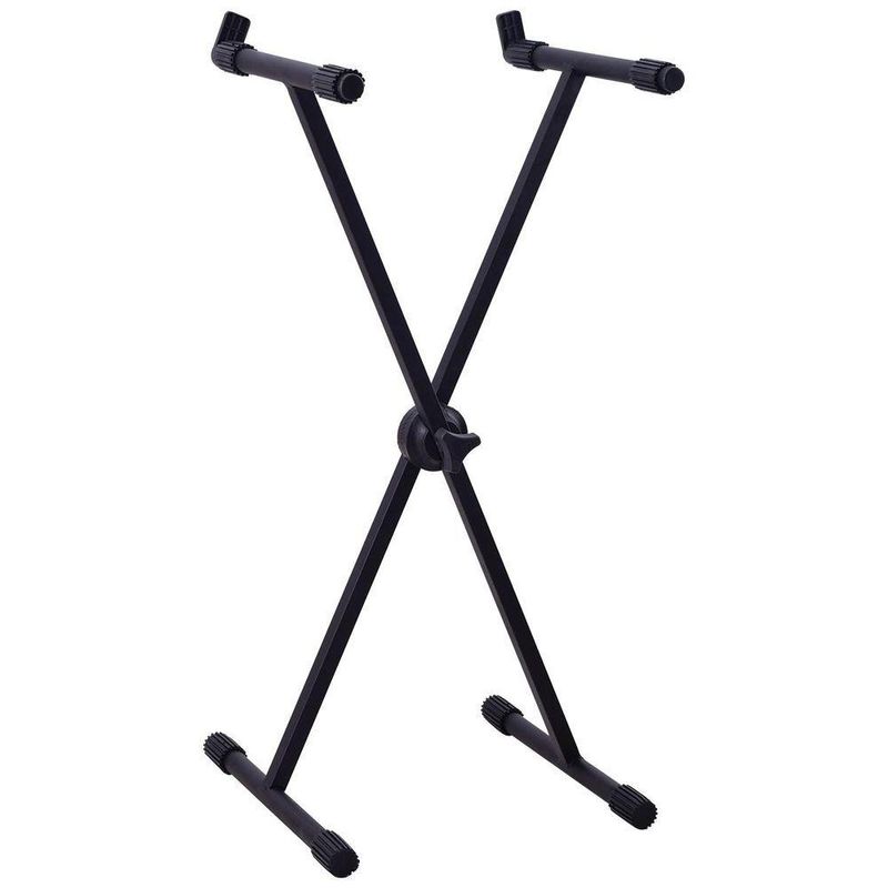 Suporte Para Teclado X10 PretoO Suporte para Teclados X10 possui estrutura em ?x? com regulagem de altura, base e apoios em ferro e pintura eletrostática Menor que o X30, geralmente é usado na posição sentado, leve e pratico Capacidade 15 Kg Peso 2,6 Kg Dimensões comp. 43; alt. 92; larg. 12 cm
