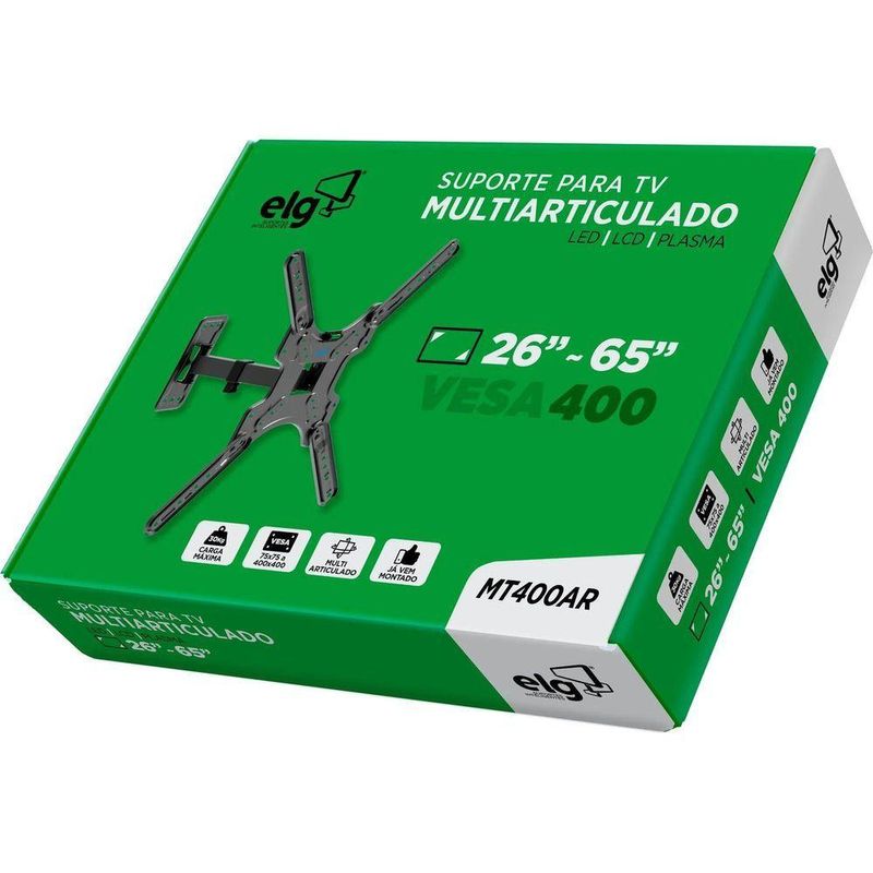 Suporte Para Tv Articulado Elg Mt400ar 26-65" PretoModelo: MT400ARO Suporte Para TV Multiarticulado ELG MT400AR é um modelo compatível com TVs de 26 a 65 que apresentem peso máximo de 30kg e padrão de furação VESA 75x75 a 400x400mm (HxV).Possuindo afastamento mínimo da parede de 6 cm e afastamento máximo de 25,5cm, este modelo garante movimentos de giro horizontal de até +90° (retrato/paisagem), inclinação vertical de +5° a -10°. Praticidade no cotidiano e integração entre ambientes, o Suporte Para TV Multiarticulado ELG MT400AR já vem montado de fábrica e possui instalação simples e intuitiva em apenas 3 passos.Cor: PretoInformação adicional:? Carga Max(KG): 30kg? Distância TV: 6 a 25,5cm? Fabricação: Aço carbono? Giro Horizontal: Até 90° para a esquerda ou direita (limitado ao tamanho da TV)? Inclinação Vertical: +5° a -10° (TILT)? Padrão VESA: 75x75 a 400x400mm (HxV)? Pintura: Epóxi eletrostática? Polegadas: 26 a 65? Tipo: Articulado? Tipo TV: LED / LCD / PLASMA / 3D? Tratamento Superficial: AnticorrosãoExtras? Parafuso de segurança;? Organizador de cabos;? Sistema de engate rápido;? Movimentos leves e precisos para melhor posicionamento da TV;? Nível bolha incluso.Itens Inclusos? 01 Suporte multiarticulado? 01 Kit de acessórios para instalação na parede e no televisor? 01 Manual de instruções? 04 ProlongadoresInstalaçãoLeia atentamente o manual antes de instalar.Verifique se a superfície de instalação apresenta resistência suficiente para uma instalação segura.Fique atento a carga máxima indicada para o suporte.Aconselhamos que a instalação seja realizada por um profissional da área.A ELG não se responsabiliza por problemas ocasionados pela incorreta instalação ou peças acopladas aos suportes. A garantia limita-se apenas ao suporte, desde que todas as recomendações acima sejam respeitadas, principalmente o peso de seu monitor/TV.