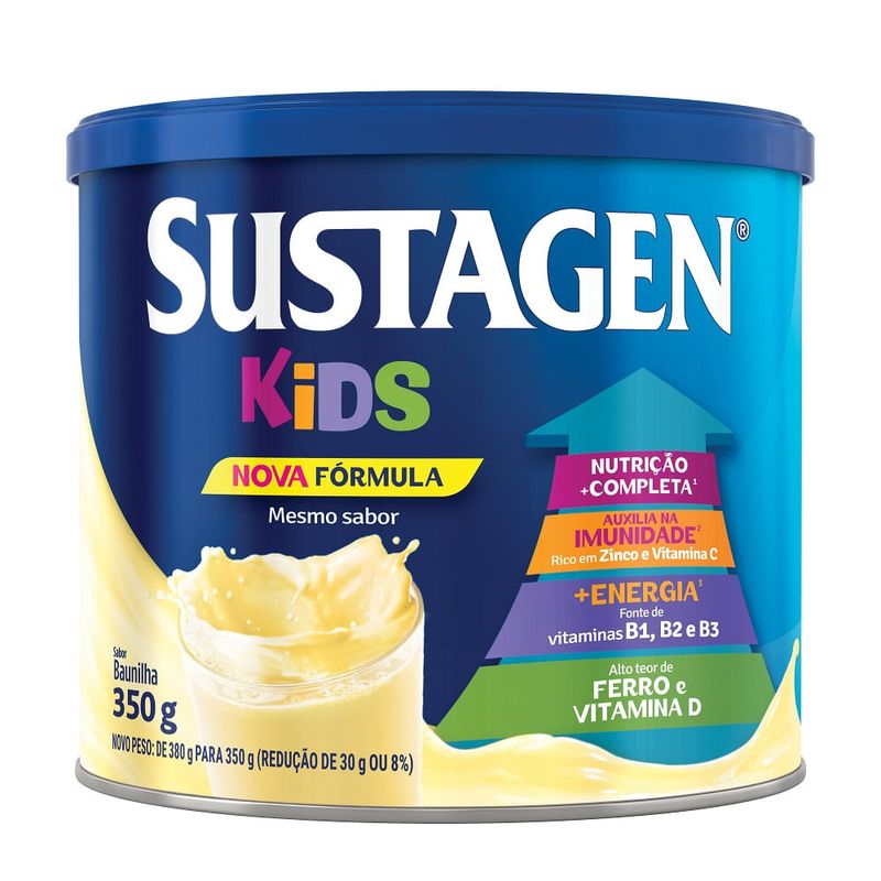 Sustagen Kids Sabor Baunilha 350g Para que serve? Sustagen Kids Sabor Baunilha 350g é um complemento alimentar infantil desenvolvido para ajudar a equilibrar a nutrição das crianças durante a fase de crescimento. Sua fórmula contém 27 vitaminas e minerais essenciais, que atuam diretamente no fortalecimento do sistema imunológico, no desenvolvimento dos ossos, músculos e no bom funcionamento do corpo. Ideal para complementar a alimentação de forma segura, prática e saborosa. Como usar? Adicione 3 colheres de sopa (27g) em 180ml de leite integral e misture bem até dissolver completamente. O produto rende até 14 copos de 180ml por lata de 350g. Pode ser consumido no café da manhã, lanche da tarde ou como complemento nutricional indicado por um profissional de saúde. Composição nutricional Fonte de cálcio, ferro, zinco, vitaminas A, C, D, E, complexo B e outros nutrientes presentes nos grupos alimentares da pirâmide nutricional. Produto não contém glúten. Advertências e segurança Este produto não substitui uma alimentação equilibrada. Seu consumo deve estar associado a uma dieta saudável e orientado por médico ou nutricionista. Uso exclusivo para o público infantil. Armazene em local seco, fresco e ao abrigo da luz. Principais Benefícios Contém 27 vitaminas e minerais essenciais Apoia o crescimento e desenvolvimento infantil Sabor baunilha que as crianças adoram Fácil preparo e excelente rendimento Complemento ideal para uma dieta equilibrada Dica Inclua Sustagen Kids na rotina alimentar das crianças com criatividade: pode ser usado em vitaminas, mingaus e receitas infantis para variar o cardápio sem perder os benefícios nutricionais.