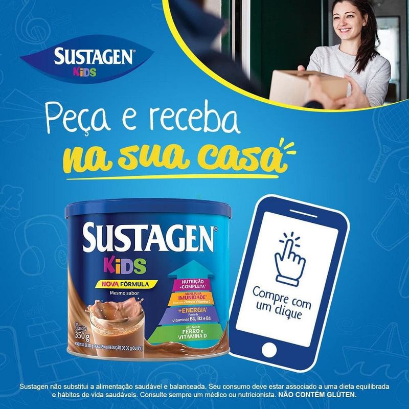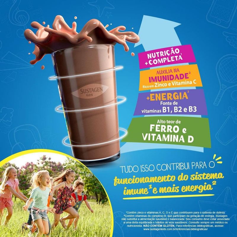 Sustagen Kids Sabor Chocolate 350g Para que serve? Sustagen Kids Sabor Chocolate 350g é um complemento alimentar infantil ideal para apoiar o crescimento saudável e o bom funcionamento do organismo. Com uma fórmula rica em 27 vitaminas e minerais, ajuda a suprir carências nutricionais da alimentação diária das crianças. Tudo isso com um sabor de chocolate delicioso, que agrada os pequenos e facilita a rotina dos pais. Como usar? Adicione 3 colheres de sopa (27g) em 180ml de leite integral. Misture bem até dissolver. Pronto para servir no café da manhã, no lanche da tarde ou em qualquer momento do dia. A lata de 350g rende até 14 copos de 180ml. Composição nutricional Rico em cálcio, ferro, zinco, vitaminas A, C, D, E e complexo B, entre outros nutrientes presentes nos grupos da pirâmide alimentar. Produto não contém glúten. Advertências e segurança Este produto não substitui uma alimentação equilibrada. Seu consumo deve estar associado a uma dieta saudável e à prática de hábitos de vida saudáveis. Sempre consulte o pediatra ou nutricionista. Armazene em local seco, fresco e protegido da luz solar. Principais Benefícios 27 vitaminas e minerais para uma nutrição completa Auxilia no crescimento e desenvolvimento das crianças Sabor chocolate irresistível Pronto para o preparo com leite Excelente rendimento: até 14 porções por lata Dica Você também pode usar Sustagen Kids Sabor Chocolate em receitas como vitaminas, bolos e mingaus, tornando a alimentação ainda mais divertida e nutritiva.