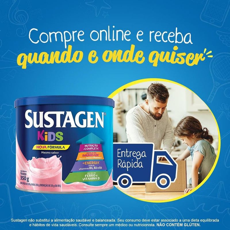 Sustagen Kids Sabor Morango 350g Para que serve? Sustagen Kids Sabor Morango 350g é um complemento alimentar infantil desenvolvido para auxiliar na nutrição de crianças, especialmente aquelas mais seletivas na hora de comer. Com 27 vitaminas e minerais essenciais, sua fórmula ajuda a fortalecer o sistema imunológico, a promover o crescimento saudável e a manter o bom funcionamento do corpo. Tudo isso com um delicioso sabor de morango que agrada os pequenos e facilita a rotina alimentar da família. Como usar? Adicione 3 colheres de sopa (27g) em 180ml de leite integral e misture bem. Pode ser servido quente (aquecendo o leite antes de adicionar o pó) ou frio. A lata de 350g rende até 14 copos de 180ml. Não ferva após o preparo para preservar o valor nutricional das vitaminas. Composição nutricional Rico em cálcio, ferro, zinco, vitaminas A, C, D, E, complexo B e outros nutrientes presentes nos grupos alimentares da pirâmide nutricional. Produto não contém glúten. Advertências e segurança Este produto não substitui uma alimentação equilibrada. Seu consumo deve estar associado a uma dieta saudável e orientado por médico ou nutricionista. Armazene em local seco, fresco e longe da luz solar direta. Indicado exclusivamente para o público infantil. Principais Benefícios 27 vitaminas e minerais que auxiliam no crescimento saudável Sabor morango irresistível Ideal para crianças seletivas na alimentação Rico em vitamina D, cálcio, zinco e complexo B Prático, nutritivo e fácil de preparar Excelente rendimento: até 14 porções por lata