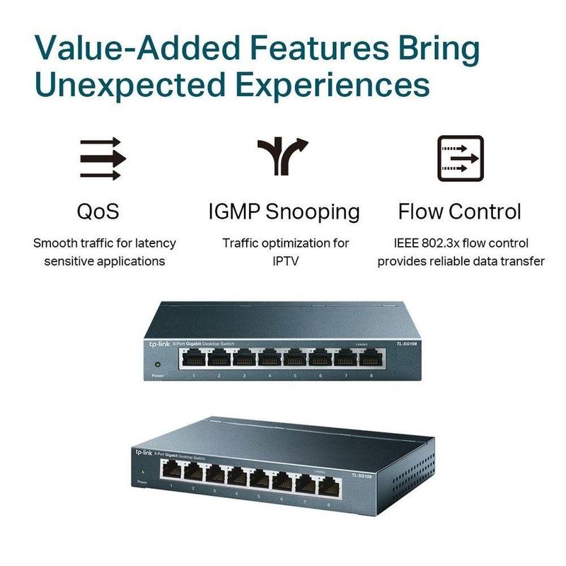 Switch 8 Portas Gigabit De Mesa 10/100/1000 Mbps Tl-sg108 SmbDescrição:Plug and Play, Amplie sua Rede Gigabit: Switch de Mesa Gigabit de 8 Portas.Mais Facilidade para seus Negócios: O Switch de Mesa TL-SG108 oferece uma maneira fácil de aumentar a velocidade de sua rede e conexões backbone. Quer você esteja em casa ou no escritório, o TL-SG108 ajuda-o a gerenciar seus negócios de forma rápida e fácil, a qualquer hora.Plug and Play, Sem Necessidade de Configuração: Um switch plug-and-play facilita a implementação, sem a necessidade de um técnico. A autonegociação em cada porta detecta a velocidade do link de um dispositivo de rede e a ajusta de maneira inteligente para compatibilidade e desempenho ótimo.Oito Portas Gigabit para Velocidades Mais Rápidas: Aumente a velocidade da sua rede com o switch de mesa Gigabit de 8 portas TL-SG108. 8 portas 10/100/1000 Mbps permitem a transferência instantânea de arquivos grandes e com uso intensivo de largura de banda, sem interferências.Recursos de Valor Agregado Possibilitam Melhor Experiência.QoS para uma Transmissão Sem Latência: Garante um tráfego uniforme para aplicativos sensíveis à latência, como voz e vídeoIGMP Snooping para Otimização Multicast: Garante uma melhor experiência de rede, especialmente para aplicativos como IPTV, otimizando a entrega de tráfego multimídia.Gabinete de Metal Contribui Para Maior Vida Útil do Produto: Os componentes internos do TL-SG108 são protegidos por um gabinete de metal de alta qualidade para garantir a vida útil do produto. Aprovado em rigorosos testes de confiabilidade, o TL-SG108 oferece um desempenho de comutação no qual você pode confiar.Seja Ecológico com Sua Rede: A última geração de Switches Não Gerenciados da TP-Link utiliza tecnologias inovadoras de economia de energia. O consumo de energia ajusta-se automaticamente de acordo com o status do link e o comprimento do cabo, permitindo que você amplie sua rede enquanto minimiza a emissão de carbono.CARACTERÍSTICAS DE HARDWARE:Padrões e Protocolos: IEEE 802.3i / 802.3u / 802.3ab/ 802.3x /802.1pInterface 8× Portas 10/100/1000 Mbps, Auto-Negociação, auto-MDI/MDIXQuantidade de Ventoinhas: Sem VentoinhaFonte de Alimentação Externa: Adaptador de Alimentação Externo (Saída: 5VDC / 0.6A)Indicador LED:Alimentação do SistemaIndicadores Link/Act por porta embutidos em cada porta RJ-45Consumo máximo de energia: 2.77 W(220V/50Hz)Dissipação de calor máxima: 9.45 BTU/hDESEMPENHO:Taxa de Encaminhamento de Pacotes: 11.9 MppsTabela de Endereços MAC: 4KMemória de Buffer de Pacote 1.5 MbJumbo Frame: 16 KBCARACTERÍSTICAS DE SOFTWARE:Características Avançadas: Tecnologia VerdeControle de Fluxo 802.3X802.1p/DSCP QoSIGMP SnoopingMétodo de Transferência: Armazenar e EncaminharPara mais informações: https://www.tp-link.com/br/home-networking/soho-switch/tl-sg108/#specificationsDescrição:Plug and Play, Amplie sua Rede Gigabit: Switch de Mesa Gigabit de 8 Portas.Mais Facilidade para seus Negócios: O Switch de Mesa TL-SG108 oferece uma maneira fácil de aumentar a velocidade de sua rede e conexões backbone. Quer você esteja em casa ou no escritório, o TL-SG108 ajuda-o a gerenciar seus negócios de forma rápida e fácil, a qualquer hora.Plug and Play, Sem Necessidade de Configuração: Um switch plug-and-play facilita a implementação, sem a necessidade de um técnico. A autonegociação em cada porta detecta a velocidade do link de um dispositivo de rede e a ajusta de maneira inteligente para compatibilidade e desempenho ótimo.Oito Portas Gigabit para Velocidades Mais Rápidas: Aumente a velocidade da sua rede com o switch de mesa Gigabit de 8 portas TL-SG108. 8 portas 10/100/1000 Mbps permitem a transferência instantânea de arquivos grandes e com uso intensivo de largura de banda, sem interferências.Recursos de Valor Agregado Possibilitam Melhor Experiência.QoS para uma Transmissão Sem Latência: Garante um tráfego uniforme para aplicativos sensíveis à latência, como voz e vídeoIGMP Snooping para Otimização Multicast: Garante uma melhor experiência de rede, especialmente para aplicativos como IPTV, otimizando a entrega de tráfego multimídia.Gabinete de Metal Contribui Para Maior Vida Útil do Produto: Os componentes internos do TL-SG108 são protegidos por um gabinete de metal de alta qualidade para garantir a vida útil do produto. Aprovado em rigorosos testes de confiabilidade, o TL-SG108 oferece um desempenho de comutação no qual você pode confiar.Seja Ecológico com Sua Rede: A última geração de Switches Não Gerenciados da TP-Link utiliza tecnologias inovadoras de economia de energia. O consumo de energia ajusta-se automaticamente de acordo com o status do link e o comprimento do cabo, permitindo que você amplie sua rede enquanto minimiza a emissão de carbono.CARACTERÍSTICAS DE HARDWARE:Padrões e Protocolos: IEEE 802.3i / 802.3u / 802.3ab/ 802.3x /802.1pInterface 8× Portas 10/100/1000 Mbps, Auto-Negociação, auto-MDI/MDIXQuantidade de Ventoinhas: Sem VentoinhaFonte de Alimentação Externa: Adaptador de Alimentação Externo (Saída: 5VDC / 0.6A)Indicador LED:Alimentação do SistemaIndicadores Link/Act por porta embutidos em cada porta RJ-45Consumo máximo de energia: 2.77 W(220V/50Hz)Dissipação de calor máxima: 9.45 BTU/hDESEMPENHO:Taxa de Encaminhamento de Pacotes: 11.9 MppsTabela de Endereços MAC: 4KMemória de Buffer de Pacote 1.5 MbJumbo Frame: 16 KBCARACTERÍSTICAS DE SOFTWARE:Características Avançadas: Tecnologia VerdeControle de Fluxo 802.3X802.1p/DSCP QoSIGMP SnoopingMétodo de Transferência: Armazenar e EncaminharPara mais informações: https://www.tp-link.com/br/home-networking/soho-switch/tl-sg108/#specifications