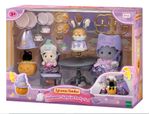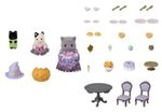 Sylvanian Families Halloween Doçuras Ou Travessuras 5764 Este playset inclui uma menina, um bebê e um bebê de colo, acompanhados de mesa, cadeiras, doces e acessórios para uma festa de Halloween. Recursos divertidos: capas que transformam os personagens em criaturas de Halloween, um bolo que muda de formato, uma abóbora de Halloween (jack-o’-lantern) para se esconder e muito mais! Vire as capas da gatinha persa e do bebê gatinho de smoking para transformá-los em fantasmas de Halloween! Vire o bolo de frutas vermelhas para transformá-lo em um elegante bolo de duas camadas! É possível inserir decorações de chocolate e velas no bolo e nos cupcakes. O bebê de colo Gato da Meia-Noite cabe dentro da abóbora de Halloween. Coloque o chapéu na abóbora para escondê-lo! A parte de trás da abóbora pode ser usada como um sofazinho para o bebê. Acessórios: mesa, cadeira x 2, prato (grande) x 2, prato (médio) x 2, xícara de chá x 2, pires x 2, garfo x 2, colher x 2, boleira (suporte para bolo), bolo (parte inferior), bolo (parte superior), decoração de chocolate (casa), decoração de chocolate (fantasma), vela, cupcake (gato), cupcake (creme), pudim de abóbora (abóbora), pudim de abóbora (fantasma), tampa de pudim de abóbora x 2, abóbora de Halloween (jack-o'-lantern), chapéu. Aviso legal • Recomendado a partir dos 3 anos.