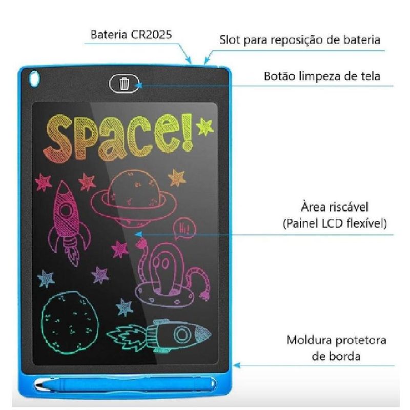 Perfeito tanto para pessoas de negócios, designers, engenheiros, professores, estudantes, etc, quanto para crianças que gostam de desenhar/escrever! A Lousa mágica pode ser usado como um quadrado-letreiro para a família, que pode ser colocado sobre a mesa ou balcão como recado de avisos! Nunca mais use papel! Um ótimo ajudante para estudantes: notas de aula, rascunhos científicos de equações para resolver problemas matemáticos! Notas de rodapé, onde o único limite é onde sua imaginação pode te levar! Como Usar: - Antes de usar. Alterne o botão de bloqueio (parte traseira do produto) para desbloquear a trava, retire a caneta e escreva diretamente na tela lcd. - Pressione o botão Limpar e aguarde 2 segundos antes de tentar novamente. - Use o botão de bloqueio (parte traseira do produto) para manter o conteúdo escrito na tela. - Remova a tampa da bateria na parte traseira para substituir a bateria (em caso de falha ou desgaste da energia) - A bateria de botão (cr 2025) é usada para este produto. atenção! 1. Para a primeira vez de uso, alguns traços podem aparecer na tela devido à pressão no processo de transporte ou armazenamento: é normal, basta pressionar o botão de apagar para limpar! 2. Se o produto não for usado por um longo período, a bateria ficará em um estado inativo. Pressione o botão de apagar repetidamente cerca de 5 vezes para acordar a tela de hibernação. 3. Enquanto pressiona o botão de apagar, uma tela inicial aparecerá. Isso é normal e não causará nenhum impacto ou dano aos olhos. 4. Evite usar em ambientes com mudanças de temperatura extremas ou rápidas, como alta temperatura (acima de 40°C ou abaixo de 0°C) e luz solar direta a longo periodo. 5. O digitalizador eletrônico usa uma escrita sensível à pressão. Escrever com força acima de 200g levará a danos reversíveis à tela lcd. 6. Use apenas os materiais incluídos para que não haja dano ao produto.