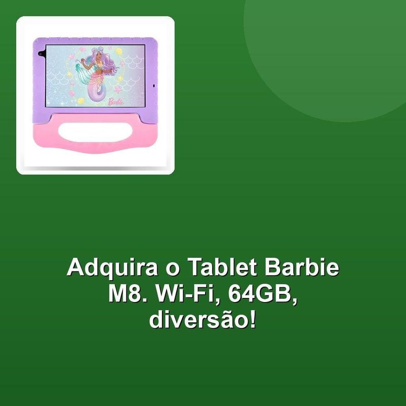 Tablet Multilaser Barbie M8 Nb434 Wi-fi 4/64gbDescubra o Tablet Multilaser Barbie M8 NB434, a combinação perfeita de estilo e funcionalidade. Com uma tela de 8 polegadas e processador Octa Core, ele oferece desempenho fluido para todas as suas atividades. A memória interna de 64GB, expansível, garante espaço para seus aplicativos e arquivos. O design em rosa vibrante encanta, enquanto a conectividade Wi-Fi e Bluetooth mantém você sempre conectado. As câmeras de 2MP e 5MP capturam momentos especiais, e a bateria de 4000mAh assegura horas de diversão. Leve e compacto, é ideal para acompanhar o dia a dia das crianças.Descubra o Tablet Multilaser Barbie M8 NB434, a combinação perfeita de estilo e funcionalidade. Com uma tela de 8 polegadas e processador Octa Core, ele oferece desempenho fluido para todas as suas atividades. A memória interna de 64GB, expansível, garante espaço para seus aplicativos e arquivos. O design em rosa vibrante encanta, enquanto a conectividade Wi-Fi e Bluetooth mantém você sempre conectado. As câmeras de 2MP e 5MP capturam momentos especiais, e a bateria de 4000mAh assegura horas de diversão. Leve e compacto, é ideal para acompanhar o dia a dia das crianças.