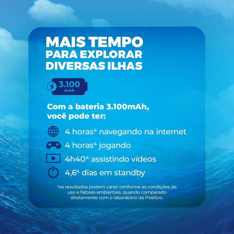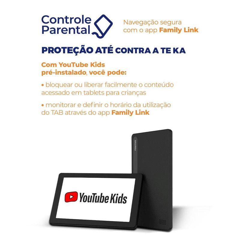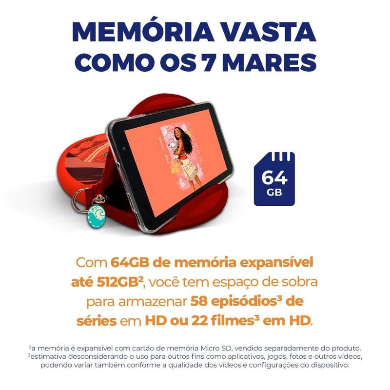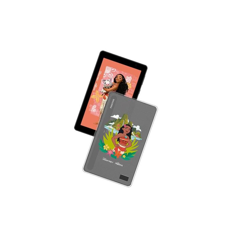 Desempenho Potente para uma Experiência EnriquecedoraO Tablet Positivo Vision TAB 7 Moana foi projetado para acompanhar a energia das crianças em todas as aventuras digitais. Equipado com um processador octa-core de alta performance, ele oferece um desempenho até 90% superior em comparação com outros tablets de 7” disponíveis no mercado. Com 3GB de memória RAM real, o Vision TAB 7 Moana proporciona uma navegação fluida e ágil, ideal para jogos, vídeos e aplicativos educativos. Esse desempenho aprimorado garante que as crianças possam se divertir e aprender sem interrupções.Tela IPS Vibrante para Entretenimento ImersivoO Vision TAB 7 Moana conta com uma tela de 7” IPS com resolução de 1024 x 600, que incorpora a tecnologia Full Lamination para imagens nítidas e cores vibrantes. Essa configuração não só melhora a visualização, mas também enriquece a experiência digital, tornando o conteúdo ainda mais cativante. Inspirado na frase "É assim que encontramos nosso caminho", o tablet permite que as crianças naveguem com facilidade pelo mundo digital, proporcionando uma interface intuitiva e de fácil uso.Bateria Duradoura e Design EleganteCom uma bateria de 3100mAh*, o Vision TAB 7 Moana permite horas de uso contínuo, evitando recargas frequentes e garantindo diversão prolongada. Seu design com bordas finas e acabamento "leather feeling" oferece um toque suave e confortável, além de proporcionar maior aderência e segurança. Esse acabamento também reflete o estilo e a praticidade que os pequenos aventureiros precisam, somando durabilidade e elegância ao tablet.Espaço de Armazenamento Amplo e Controle ParentalCom capacidade de armazenamento expansível até 512GB**, o Vision TAB 7 Moana oferece espaço de sobra para todos os aplicativos, jogos e vídeos favoritos. Além disso, o tablet é equipado com controle parental avançado, permitindo que os pais monitorarem o tempo de uso e criarem um ambiente seguro para as crianças. Com inspiração no espírito aventureiro de Moana, o Vision TAB 7 Moana é ideal para preservar memórias digitais de forma acessível e segura.Proteção Extra para Aventura e DiversãoPara garantir a durabilidade, o Vision TAB 7 Moana inclui dois itens protetores: uma capa de silicone e uma bolsa de neoprene. Essas capas são resistentes a quedas e facilitam o manuseio, garantindo proteção em qualquer situação. A capa de neoprene, com alça de transporte e uma presilha em formato de flor, característica de Moana, também se transforma em suporte de bancada, tornando o tablet ainda mais prático e divertido para as crianças. Com Wi-Fi, Bluetooth e câmera, o Vision TAB 7 Moana transforma cada momento em uma aventura digital inspiradora e inesquecível.