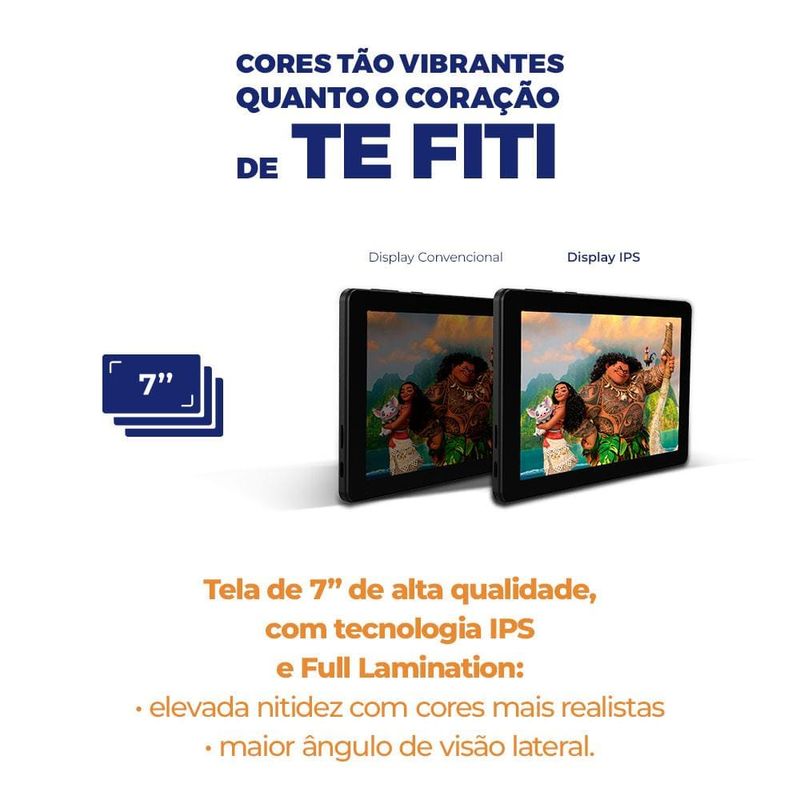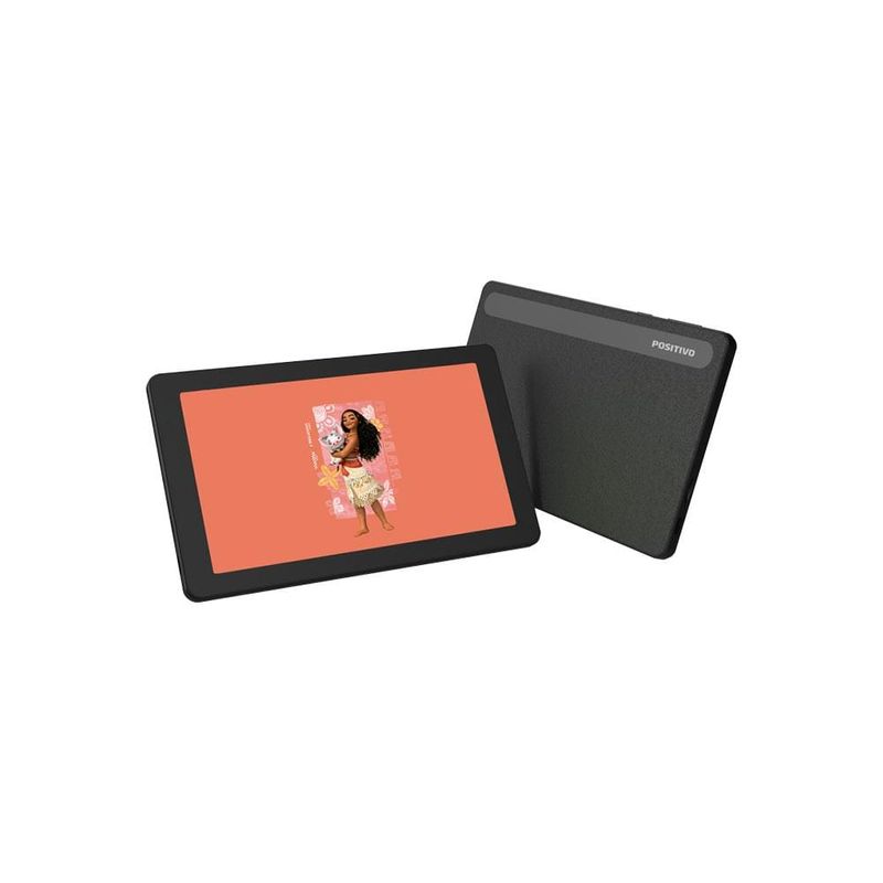 Desempenho Potente para uma Experiência EnriquecedoraO Tablet Positivo Vision TAB 7 Moana foi projetado para acompanhar a energia das crianças em todas as aventuras digitais. Equipado com um processador octa-core de alta performance, ele oferece um desempenho até 90% superior em comparação com outros tablets de 7” disponíveis no mercado. Com 3GB de memória RAM real, o Vision TAB 7 Moana proporciona uma navegação fluida e ágil, ideal para jogos, vídeos e aplicativos educativos. Esse desempenho aprimorado garante que as crianças possam se divertir e aprender sem interrupções.Tela IPS Vibrante para Entretenimento ImersivoO Vision TAB 7 Moana conta com uma tela de 7” IPS com resolução de 1024 x 600, que incorpora a tecnologia Full Lamination para imagens nítidas e cores vibrantes. Essa configuração não só melhora a visualização, mas também enriquece a experiência digital, tornando o conteúdo ainda mais cativante. Inspirado na frase "É assim que encontramos nosso caminho", o tablet permite que as crianças naveguem com facilidade pelo mundo digital, proporcionando uma interface intuitiva e de fácil uso.Bateria Duradoura e Design EleganteCom uma bateria de 3100mAh*, o Vision TAB 7 Moana permite horas de uso contínuo, evitando recargas frequentes e garantindo diversão prolongada. Seu design com bordas finas e acabamento "leather feeling" oferece um toque suave e confortável, além de proporcionar maior aderência e segurança. Esse acabamento também reflete o estilo e a praticidade que os pequenos aventureiros precisam, somando durabilidade e elegância ao tablet.Espaço de Armazenamento Amplo e Controle ParentalCom capacidade de armazenamento expansível até 512GB**, o Vision TAB 7 Moana oferece espaço de sobra para todos os aplicativos, jogos e vídeos favoritos. Além disso, o tablet é equipado com controle parental avançado, permitindo que os pais monitorarem o tempo de uso e criarem um ambiente seguro para as crianças. Com inspiração no espírito aventureiro de Moana, o Vision TAB 7 Moana é ideal para preservar memórias digitais de forma acessível e segura.Proteção Extra para Aventura e DiversãoPara garantir a durabilidade, o Vision TAB 7 Moana inclui dois itens protetores: uma capa de silicone e uma bolsa de neoprene. Essas capas são resistentes a quedas e facilitam o manuseio, garantindo proteção em qualquer situação. A capa de neoprene, com alça de transporte e uma presilha em formato de flor, característica de Moana, também se transforma em suporte de bancada, tornando o tablet ainda mais prático e divertido para as crianças. Com Wi-Fi, Bluetooth e câmera, o Vision TAB 7 Moana transforma cada momento em uma aventura digital inspiradora e inesquecível.