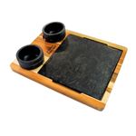 Tábua com 02 Molheiras em Pedra Sabão e Suporte G 25x25cm Ela é antiaderente naturalmente, o que facilita sua higienização (limpeza) e termicamente considerada inerte, ou seja, demora esfriar o alimento. Sua utilização pela população local baseia-se no preparo de carnes, grelhados, peixes e etc. Surpreenda sua família e amigos servindo aquele saboroso churrasco nesta tábua de pedra. Acompanha as molheiras, você vai poder combinar seus molhos favoritos com as refeições. Além de poder grelhar a carne diretamente na pedra, também é possível aquecer a pedra e usá-la para servir porções quentes por mais tempo, pois ela se manterá quente mesmo após retirar do fogo. É um ótimo produto para servir porções, tanto no restaurante para os clientes como em almoços de família, lanches no fim da tarde, reuniões e etc. Obs: as peças de pedra de sabão já vão curadas. Características Técnicas:Medida Molheira: 8x4cm (LxA).Medida Total: 36x28x6cm.Medida Tábua: 25x25cm.Peso: 3kg. Itens Inclusos:01 Tábua com 02 Molheiras em Pedra Sabão e Suporte G 25x25cm. Código: 148INDSJ.