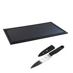 Tabua de corte em polietileno virgem (não reciclado) - PEAD, um material de alta qualidade, resistente, de fácil lavagem, atóxico. Sem manchas. Com canaleta e furo para pendurar. Com uma faca utilidades de aço inox com tamanho total de 19,5 cm com lamina de 4 pol e capa. O PEAD (polietileno) é um material atóxico, aprovado e orientado pela Vigilância Sanitária (ANVISA) pra utilização em cozinhas residenciais ou profissionais, devido ao desempenho e facilidades do produto, aliado a segurança e manuseio dos alimentos. As diversas cores sugerem uma tábua para cada tipo de alimento, seguindo as normas internacionais de padrão de qualidade, evitando assim a contaminação cruzada. Tamanho: altura: 8mm largura: 495mm comprimento : 295mm Cor: Preta