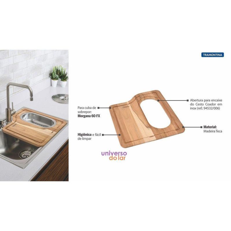 Tábua Para Cubas De Sobrepor Morgana Em Madeira 43,5 X 41 Cm TramontinaTábua para Cubas de Sobrepor Morgana em Madeira 43,5 x 41 cm Tramontina -Tábua para Cubas de Sobrepor Morgana Tramontina em Madeira 43,5 x 41 cmAdicione acessórios práticos e de bom gosto para tornar as atividades na cozinha mais gostosas. A Tábua para Cubas de Sobrepor Morgana Tramontina em Madeira 43,5 x 41 cm é ideal para as tarefas do dia a dia. Produzida em madeira teca, a tábua de corte se ajusta perfeitamente na cuba. Fabricada no Brasil, possui tamanho de 43,5 x 41 cm. Você ainda pode adicionar um cesto coador para completar suas necessidades na cozinha.Informações GeraisMaterial: Madeira TecaLocal para cesto coador: SimIndicação: Cuba MorganaRecomendações de UsoPossui proteção antibacteriana (Microban), que da mais segurança no preparo dos alimentos.Antes de usar a tábua pela primeira vez, lave com água quente, sabão e enxugue-a bem. Quando estiver seca, passe um pouco de óleo de cozinha sobre toda a superfície, retirando bem o excesso.Após cada uso, lave o produto sempre com água e sabão neutro, secando-o com toalha de pano.A necessidade de limpeza (lavar, secar e armazenar corretamente) contribui para que a tábua mantenha suas características saudáveis e naturais.Sempre deixe-a secar antes de guardá-la.Guarde-a em locais arejados.Não a deixe submersa em água nem armazenada sobre a pia.Utilizar o molde que acompanha a cuba para efetuar o corte no granito, para que a prancha se encaixe perfeitamente.Características Gerais do Produto:- Cor: MadeiraGarantia:- 3 Meses