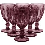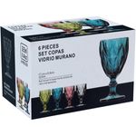 Esse jogo é composto por 6 (seis) lindas taças de vidro tipo murano. Cada taça é produzida com vidro de alta qualidade e a superfície externa possui altos-relevos de formas cruzadas que dão charme, elegância e segurança na pegada. Leve um toque de requinte à decoração da sua casa, apartamento ou escritório! DIMENSÕES DA TAÇA: Altura: 17cm Diâmetro da boca: 9cm Diâmetro da base: 8,1cm Espessura do vidro: 3,8mm Peso: 426g DIMENSÕES DA CAIXA: Altura: 17,5cm Largura: 26,5cm Profundidade: 17,5cm Peso: 2.730g