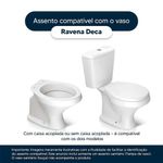 Tampa De Vaso Ravena Branco Para Bacia DecaA Tampa de Vaso Ravena Branco para bacia Deca é a escolha definitiva para elevar o padrão de higiene e sofisticação do seu banheiro!Sua proteção antimicrobiana avançada impede o crescimento de germes e bactérias, proporcionando um ambiente mais limpo e para você e sua família. Comprovada por normas internacionais, essa tecnologia mantém sua eficácia ao longo do tempo. Durabilidade e Resistência: A única marca que utiliza MDF Ultra, muito mais durável e resistente. Contém camadas de pintura laqueada, este assento oferece não apenas beleza, mas também conforto térmico e alta resistência. As ferragens em alumínio anodizado, além de um acabamento refinado, trazem resistência extra, pois não oxidam nem enferrujam. Compatibilidade: Encaixe perfeito para o modelo Ravena da marca Deca, com ou sem caixa acoplada. Detalhes: Cor: Branco Limpeza: Recomenda-se a limpeza com pano úmido e sabão neutro, não utilizar produtos abrasivos ou químicos. Não pode ser lavado com água abundante ou ficar molhado, não pode usar ducha higiênica. Fabricante do Assento Sanitário: Pontto Lavabo (enviado na caixa conforme foto no anúncio). Instalação Descomplicada: Acompanha parafusos de fixação e embalagem com instruções de montagem. Encaixe os parafusos com borrachas sobre os buracos da bacia sanitária e aperte com a chave de fenda. Observação: O código 6LPF gravado na louça sanitária refere-se ao fluxo de água da descarga, não ao modelo da mesma. Importante: Este anúncio inclui somente o produto conforme descrito acima. Elementos decorativos das fotos não estão inclusos. RBN: Casa/Banho/Instalações e Acessórios de Banheiro/Vasos Sanitários e Peças/Assento de Vaso Sanitário | Conteúdo da Embalagem: 01 Assento Sanitário | Tipo: Assento Sanitário | Produto: Assento Sanitário | Site do Fabricante: | Marca do Assento Sanitário: Pontto Lavabo | Garantia: 6 meses contra de fabricação | Dica: Instalação: sem desmontar o produto, posicione sobre o vaso sanitário e encaixe os dois parafusos com as borrachas pretas dentro do furo do vaso. Aperte com a chave de fenda no sentido horário até ficar firme. | Para Vaso Sanitário do Modelo: Ravena | Para vaso Sanitário da Marca: Deca | Cor: Branco | Tonalidade: Branco | Material do Assento Sanitário: MDF Laqueado | Instruções de Limpeza: Recomenda-se a limpeza com pano úmido e sabão neutro, não utilizar produtos abrasivos ou químicos. Não pode ser lavado com água abundante ou ficar molhado, não pode usar ducha higiênica. | Almofadado?: Não | Peso do Produto: | Tipo de Fechamento: Fechamento Comum | Material da Fixação: Alumínio Anodizado | Precisa de baterias ou pilhas: Não | Regulamentações aplicáveis a produtos perigosos: Não aplicável | Código de certificação: Não aplicável | Ponto de Destaque01: Produzido em MDF Laqueado | Ponto de Destaque02: Ferragem em Alumínio Anodizado (não enferruja, não oxida) | Ponto de Destaque03: Possui 15cm de distância entre furos | Ponto de Destaque04: Produto vai completo, fácil instalação | Ponto de Destaque05: Pontto Lavabo | Termos de Pesquisa01: Assento Sanitário; Tampa de Vaso Sanitário; Ravena Branco Deca; Ravena 6lpf; Deca 6lpf | Quantidade de itens: 1 | Fonte de energia: Não aplicável | de caixas: 1 | Dimensões da embalagem: Altura: 5cm x Largura: 40cm x Comprimento: 50cm