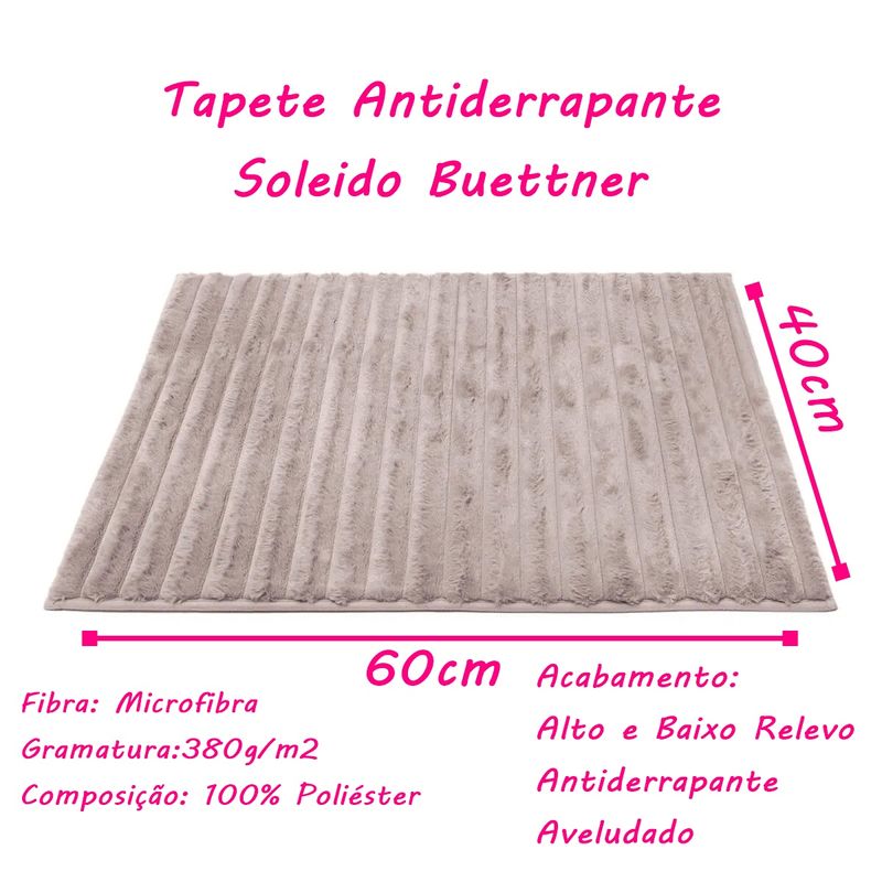 O Tapete Antiderrapante Soleido Buettner é a opção ideal para quem procura comodidade, proteção e beleza em um único item. Produzido com microfibra de alta qualidade, o Tapete Soleido oferece um toque suave e agradável, proporcionando uma sensação de suavidade a cada passo. O seu efeito felpa exclusivo oferece um acabamento elegante, trazendo conforto para qualquer espaço. Além de sua textura irresistível, possui tecnologia antiderrapante, garantindo total segurança e estabilidade, prevenindo deslizamentos e oferecendo maior tranquilidade para o uso cotidiano. Ideal para a saída do box ou para a frente de pias, o Tapete Soleido une funcionalidade e beleza, transformando seu lar com praticidade e elegância.Tapete Buettner Microfibra 100% Poliéster Antiderrapante Soleido 40x60cm CapuccinoTodas as informações divulgadas são de responsabilidade do fabricante/fornecedor.Marca: BuettnerClassificação: SoleidoTecido: MicrofibraComposição (Fios): 100% Poliéster - 380g/m2Conteúdo e Medidas: Tapete Microfibra Antiderrapante Soleido - 01 PeçaTamanho: (40cm x 60cm)Acabamento:- Alto e Baixo Relevo- Antiderrapante- Aveludado Cor: CapuccinoAntiderrapante: SimColeção / Sortimento: Tapetes ImportadosProduto Licenciado Importado e Distribuído por BoutonFabricante: ChinaReferencia: 16657Código de Barra: 7892409166578Garantia(Fabricante): Contra Defeito de FabricaçãoImagens Meramente IlustrativasINFORMAÇÕES IMPORTANTES: Item composto apenas por 01 Tapete, os demais itens são meramente decorativos e NÃO fazem parte do conteúdo da embalagem.Aviso : - Todas as medidas são valores aproximados e podem sofrer alguma variação.- As cores podem sofrer uma pequena variação, dependendo do lote do produto e das configurações do seu computador.