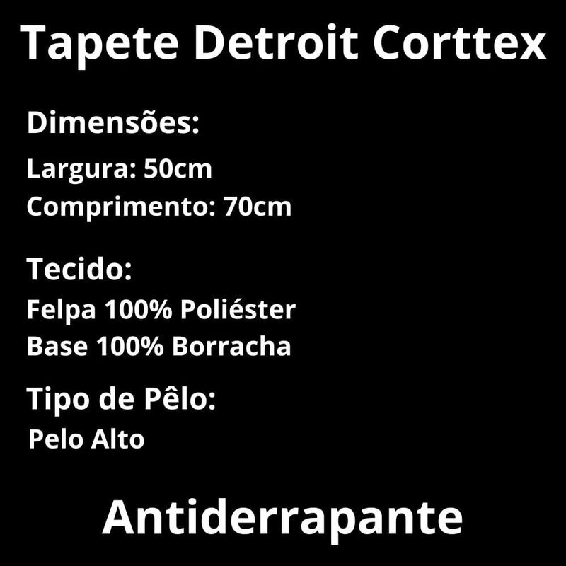 O Tapete Detroit Corttex leva um charme especial para sua casa, no tamanho 50x70cm com sua base antiderrapante, pelagem alta e sua adaptalidade a praticamente todos os ambientes da casa serve do quarto ao banheiro, deixando o ambiente requintado. Conteúdo da Embalagem:1 Tapete Detroit 50x70cmComposição:Base emborrachada antiderrapantePelo AltoTecido: 100% Poliéster Ambientes:Quarto;Sala;Cozinha;Banheiro;Instruções de Lavagem:Pode ser lavado em Máquina;Não Alvejar;Secagem a Sombra;Fabricante:Corttex