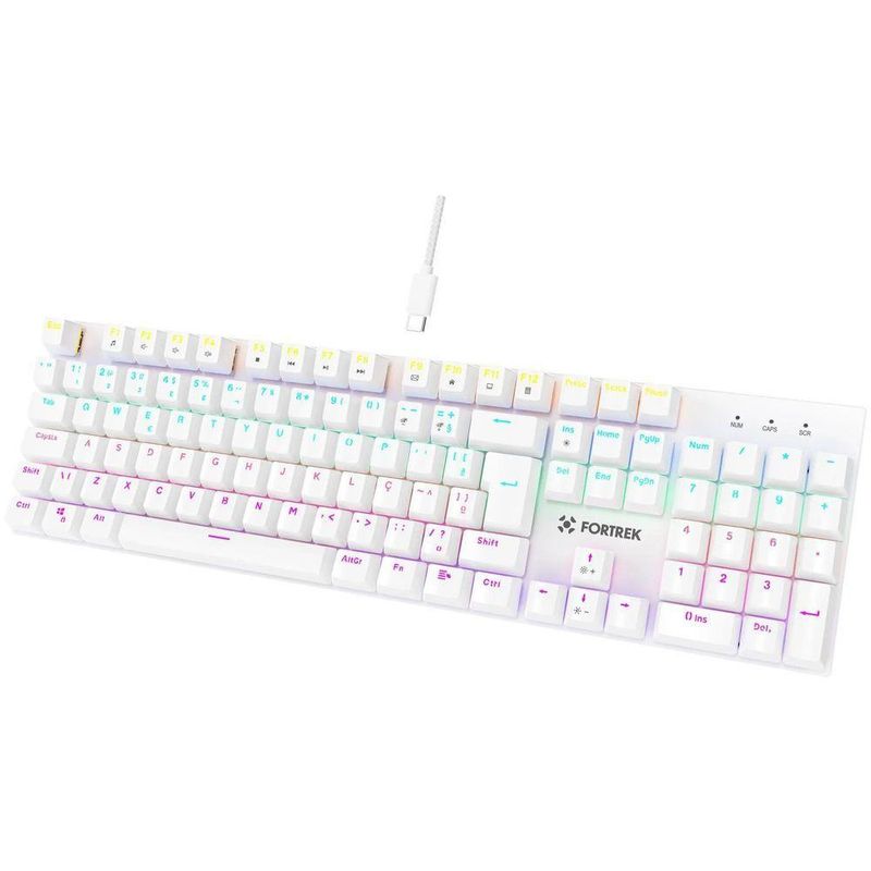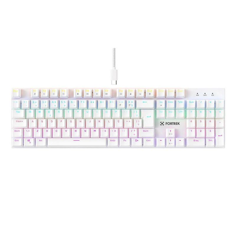 Teclado Gamer Mecânico Fortrek Gravity 100 Fullsized Switch Outemu RedModelo: Gravity 100Marca: FORTREKO Teclado Gamer Mecânico Fortrek Gravity 100 Fullsized é o modelo mais indicado para quem busca um teclado eficiente, com design minimalista. Equipado com switches OUTEMU Red, o Gravity 100 oferece uma resposta tátil suave e silenciosa, ideal para usuários que preferem um toque leve e rápido.Já a instalação é simples e imediata, sem necessidade de drivers ? é só conectar e começar a usar. Compatível com uma ampla variedade de sistemas operacionais, desde o Windows XP até o Windows 11, além de ser compatível com Mac OS X 10.2 ou superior, o Teclado Gamer Mecânico Fortrek Gravity 100 oferece versatilidade e facilidade de uso em qualquer dispositivo.Comprimento do Cabo: 1,8m nylon trançadoCompatibilidade: Win XP / Win Vista / Win 7 / Win 8 / Win 10 / Win 11 / Mac OS X 10.2 ou superiorTipo: MecânicoCor: BrancoConector: USB-C removível para UBS 2.0Padrão: ABNT2Número de teclas: 107Teclas anti-ghosting: 26Dimensões: do teclado: 426 x 120 x 36 mmInformação adicional:? Tipo de switch do teclado: Outemu red? Iluminação: Rainbow? Modos de iluminação: 21? Operação: Não requer a instalação de driver (Plug & Play)? Itens inclusos: 01 Teclado gamer Fortrek Gravity 100