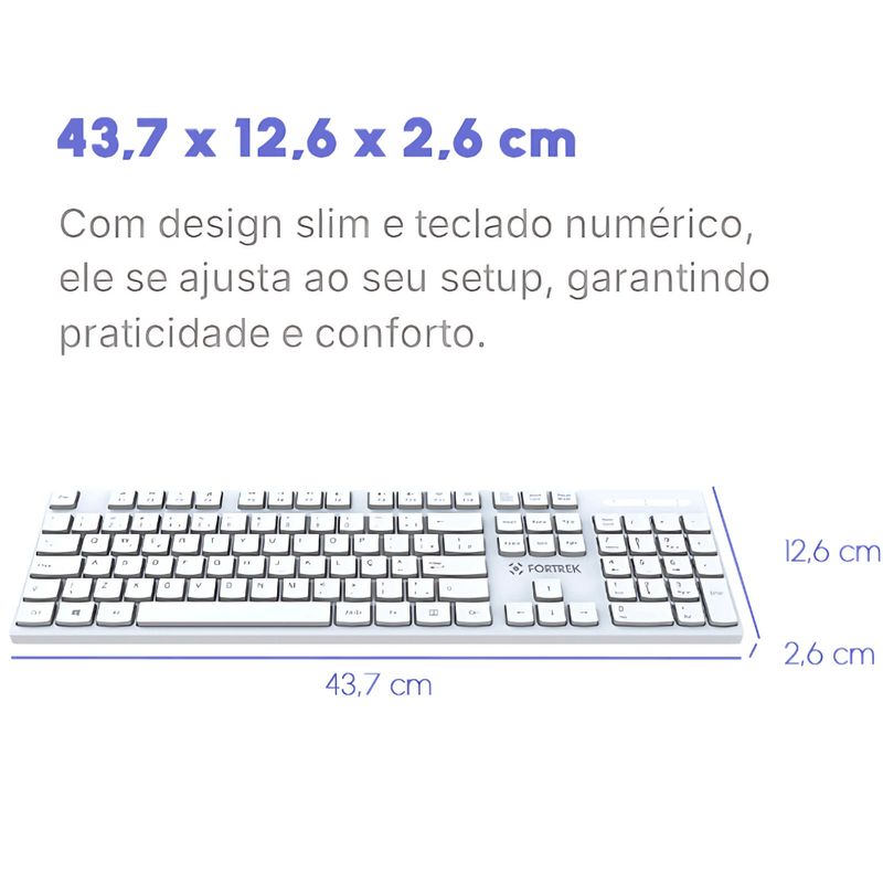 Teclado Office Slim Fortrek K15 Branco USB ABNT2 O Teclado Fortrek K15 Slim é ideal para ambientes corporativos e uso diário, oferecendo um design fino e leve que economiza espaço sem comprometer o conforto. Com layout ABNT2 e teclas de perfil baixo, proporciona uma digitação precisa e silenciosa. Sua construção resistente a respingos garante maior durabilidade. A conexão USB 2.0 com tecnologia Plug & Play permite instalação imediata em diversos dispositivos, enquanto o cabo de 1,5 metro oferece flexibilidade no posicionamento. Especificações Técnicas: Modelo: K15 Slim Conexão: USB 2.0 (Plug & Play) Comprimento do cabo: 1,5 metro Layout: ABNT2 (português brasileiro) Número de teclas: 107 Perfil das teclas: Slim (baixo) Cor: Branco Destaques: Design compacto e elegante Teclas silenciosas de perfil baixo Resistente a respingos Instalação rápida via USB Plug & Play Ideal para escritórios e uso doméstico